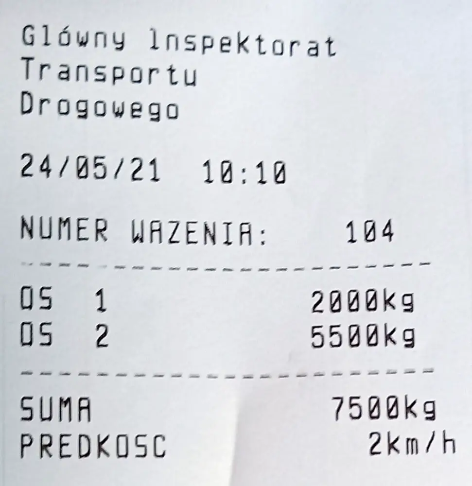 24 maja inspektorzy z Poznania patrolowali w pobliskim Przeźmierowie i zatrzymali do kontroli przeładowany samochód dostawczy o dopuszczalnej masie całkowitej do 3,5 t. Inspektorzy zobaczyli już na wagach preselekcyjnych, że pojazd był przeładowany, w tym wypadku napojami. Kontrola wagowa potwierdziła wyniki z preselekcji. Dostawczak wraz z ładunkiem ważył aż 7,5 t, czyli o całe 4 t za dużo. Waga wykazała 2 t na pierwszej osi i 5,5 t na drugiej. Inspektorzy ukarali kierowcę mandatem w wysokości 500 zł. Po nadmiar towaru przyjechała ciężarówka.
