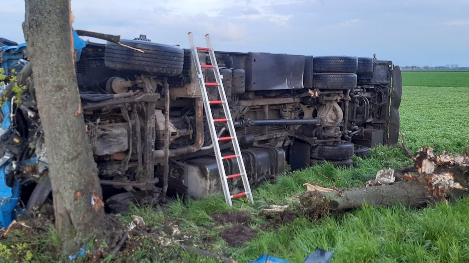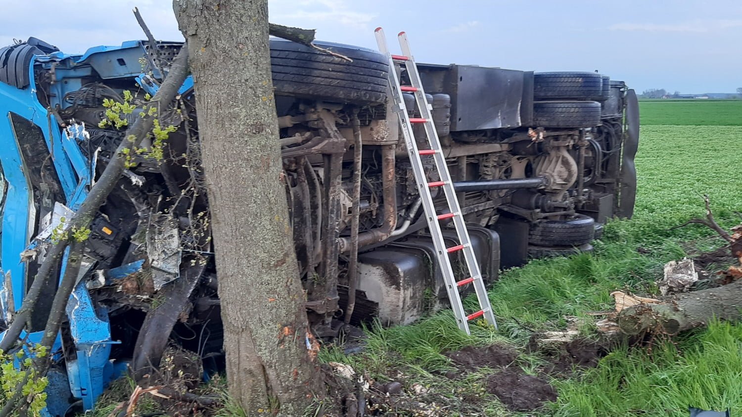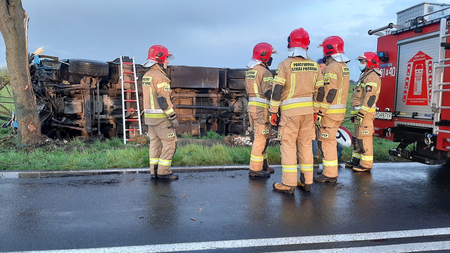 Strażacy po przybyciu we wskazane miejsce strażacy zastali ciężarówkę leżącą na boku, a kierowcy nie było w pobliżu. Służby zaczęły poszukiwania kierowcy, który niedługo później wrócił. Mężczyzna sam opuścił pojazd, nie był ranny i nie wymagał pomocy medycznej. Wytłumaczył następnie co było przyczyną wypadku. Na drogę wybiegło zwierzę po czym skręcił aby uniknąć zderzenia, wpadł w poślizg i zjechał z drogi.
