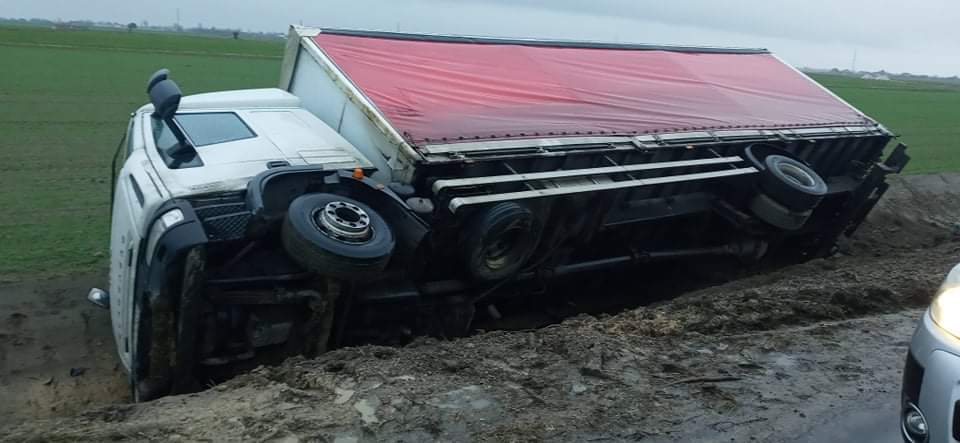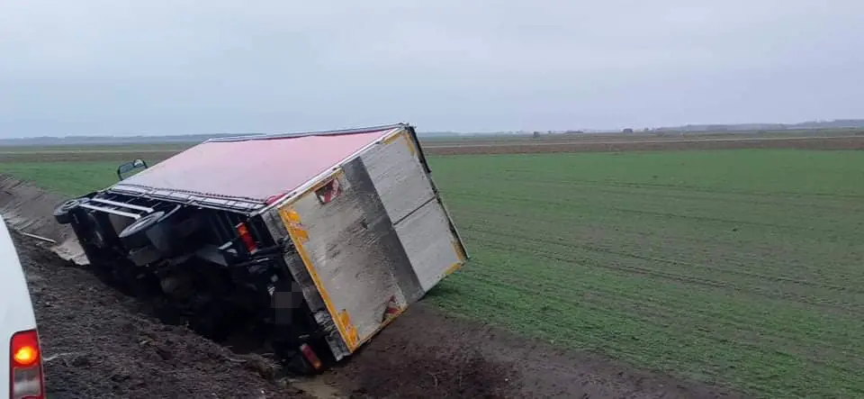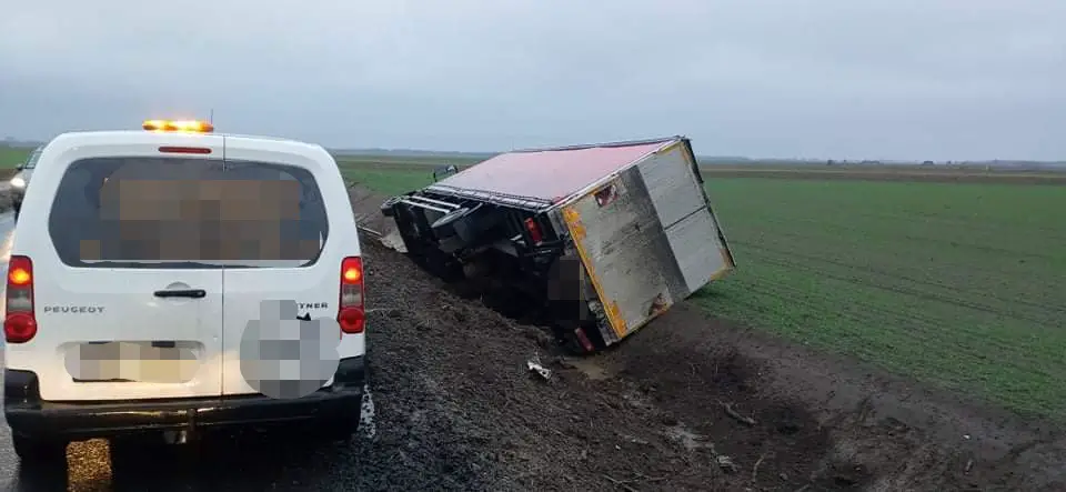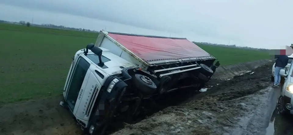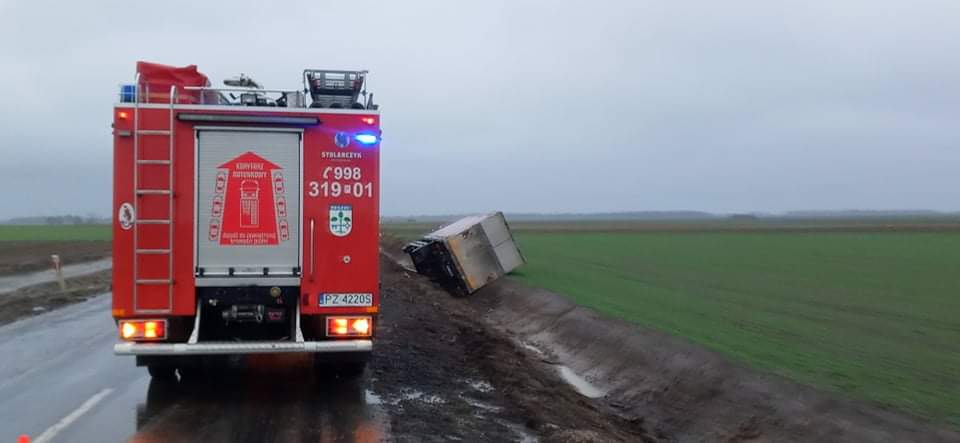 Po dojeździe na miejsce zastępu z OSP Buk zauważono leżący samochód ciężarowy Iveco w rowie na remontowanym odcinku drogi.