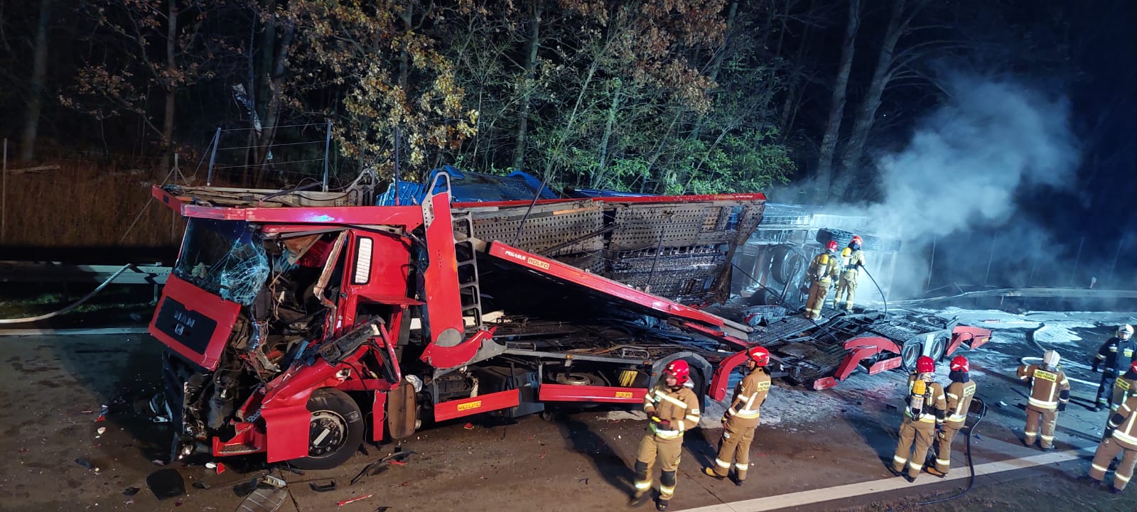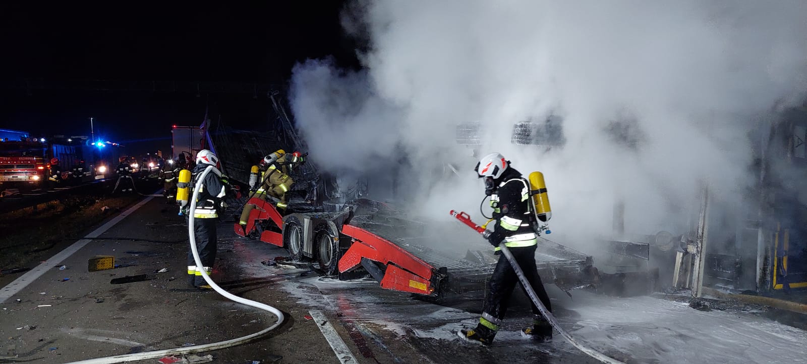 Strażacy z JRG PSP w Bolesławcu oraz jednostek OSP z Różyńca, Gromadki i Krzyżowej po przybyciu na miejsce zdarzenia ugasili pożar naczepy przy użyciu piany ciężkiej oraz rozłączyli zasilanie z akumulatorów w pojazdach. Po ugaszeniu ognia stwierdzono, że ładunek naczepy, która objęta była pożarem, stanowił odpad poprodukcyjny zawierający aluminium i w kontakcie z pianą gaśniczą zaczął się wydzielać z niego gaz z amoniakiem. W celu ustalenia dalszego postępowania na miejsce zdarzenia przybyła grupa operacyjna z Komendantem Powiatowym PSP z Bolesławca oraz strażacy z Specjalistycznej Grupy Ratownictwa Chemicznego z Legnicy. Dodatkowo w celu zabezpieczenia możliwości gaszenia nietypowego pożaru na miejsce ściągnięto również 2 średnie pojazdy z zapasem proszku gaśniczego z JRG w Bolesławcu oraz JRG w Lwówku Śląskim. Po dokładnym rozpoznaniu i ustalenia rodzaju przewożonego materiału stwierdzono, że po odparowaniu z odpadu wody wydzielanie gazu ustąpi.