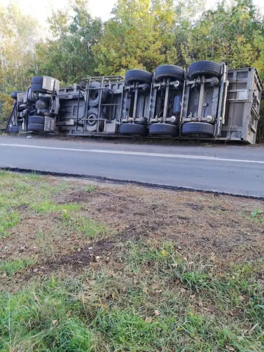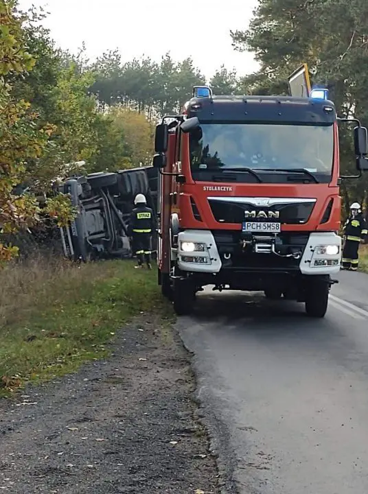 Po dojeździe pierwszych zastępów zastano ciężarówkę leżącą na boku. Strażacy zabezpieczyli odpowiednio miejsce zdarzenia, udzielili pomocy kierowcy oraz zabezpieczyli wycieki ze zbiornika paliwa.
