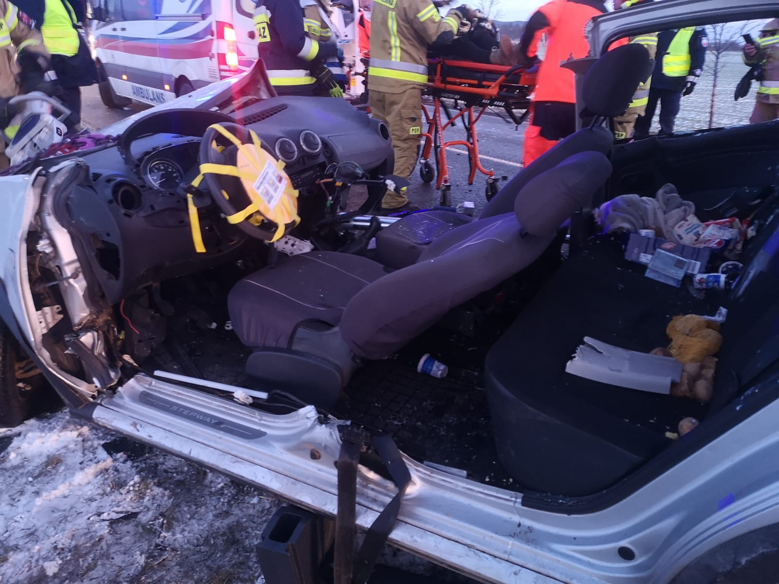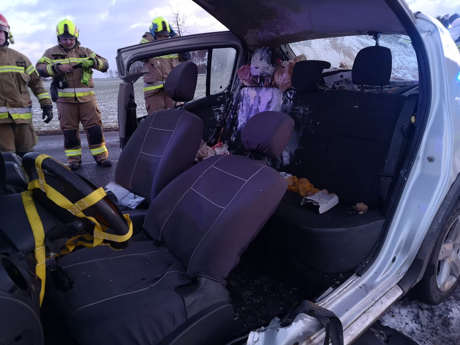 Strażacy zabezpieczyli miejsce zdarzenia i w między czasie przystąpili do uwalniania kobiety z pojazdu, najbardziej zakleszczone były jej nogi. Po wykonaniu dostępu poszkodowana została przekazana przybyłemu na miejsce Ratownictwu Medycznemu.