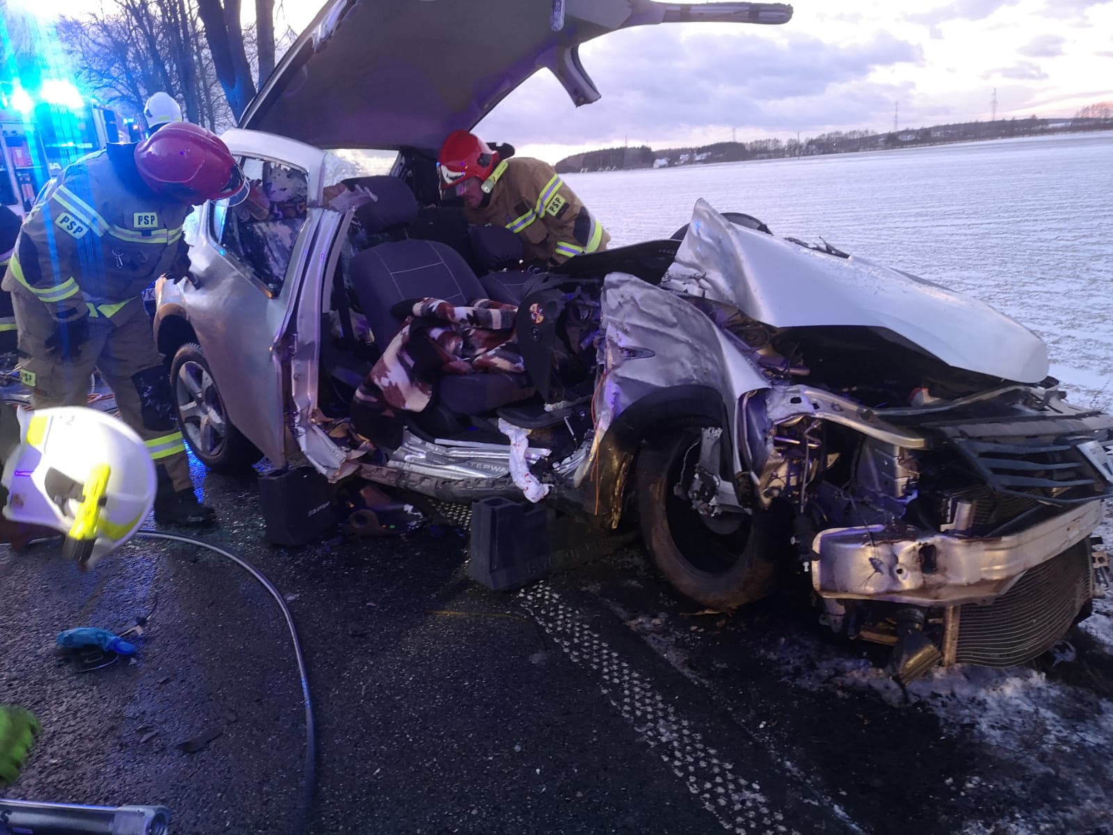 Po dotarciu pierwszych zastępów straży na miejsce ratownicy zastali kobietę w samochodzie osobowym, którym uderzyła w drzewo. Aby wydostać kobietę z pojazdu konieczne było użycie sprzętu hydraulicznego.