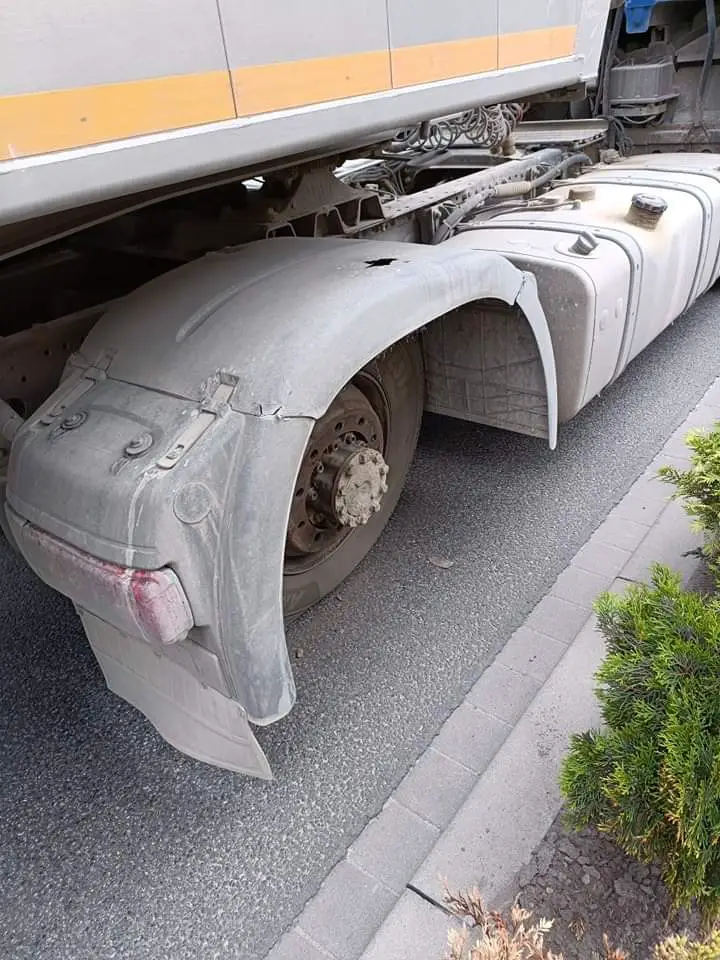 Podczas jazdy ciągnika siodłowego z naczepą przewożącego żwir urwały się śruby mocujące prawe,tylne,zewnętrzne koło od ciągnika. Następnie koło odpadło tocząc się pojezdni,wpadło na chodnik,gdzie uderzyło w matkę z dzieckiem mówi dla portalu wlkp112.pl Monika Żymełka, z leszczyńskiej policji