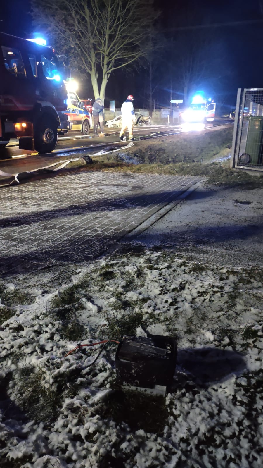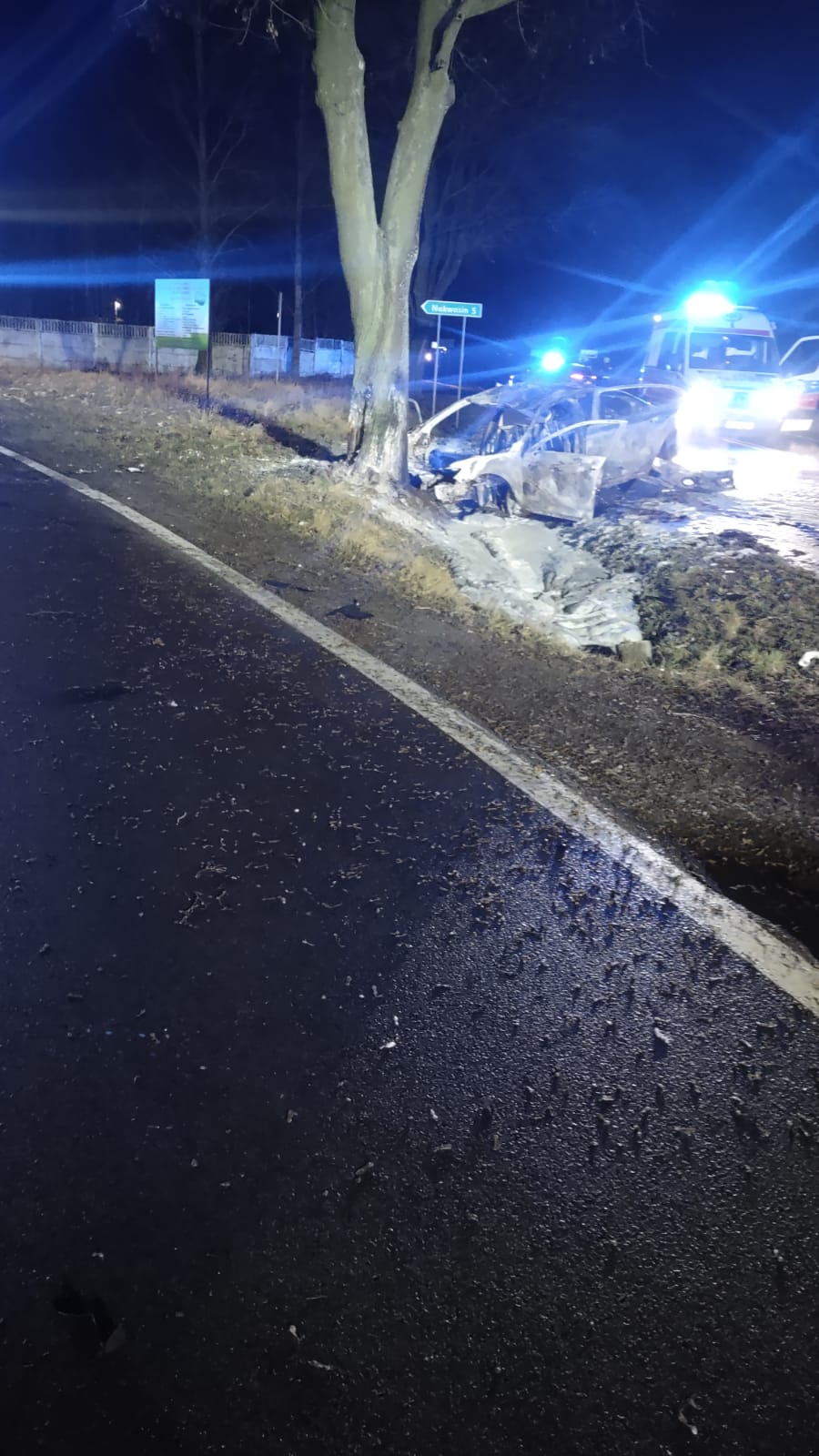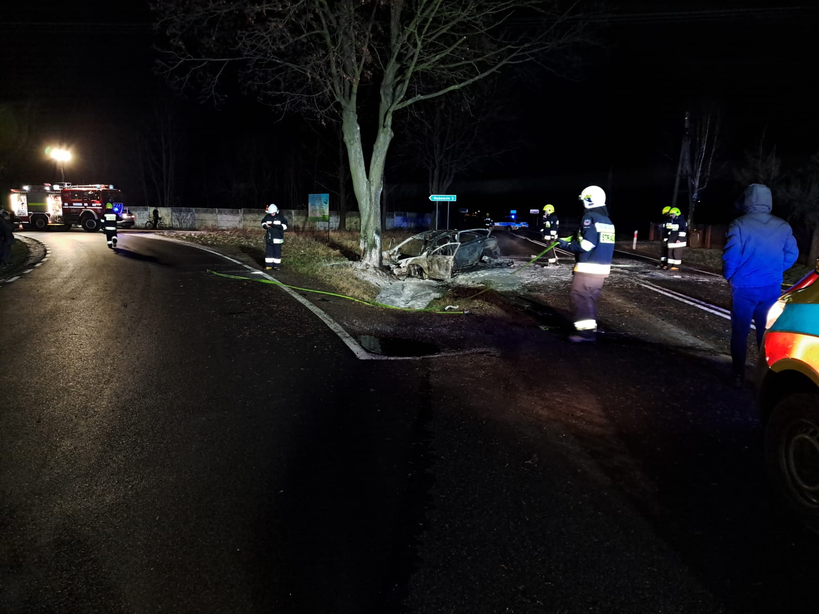 Po przybyciu na miejsce zdarzenia zastano auto osobowe rozbite na przydrożnym drzewie, całkowicie objęte pożarem. Na poboczu leżała osoba poszkodowana, która została wyciągnięta z wraku przez funkcjonariuszy patrolu Policji udzielających pierwszej pomocy przedmedycznej.