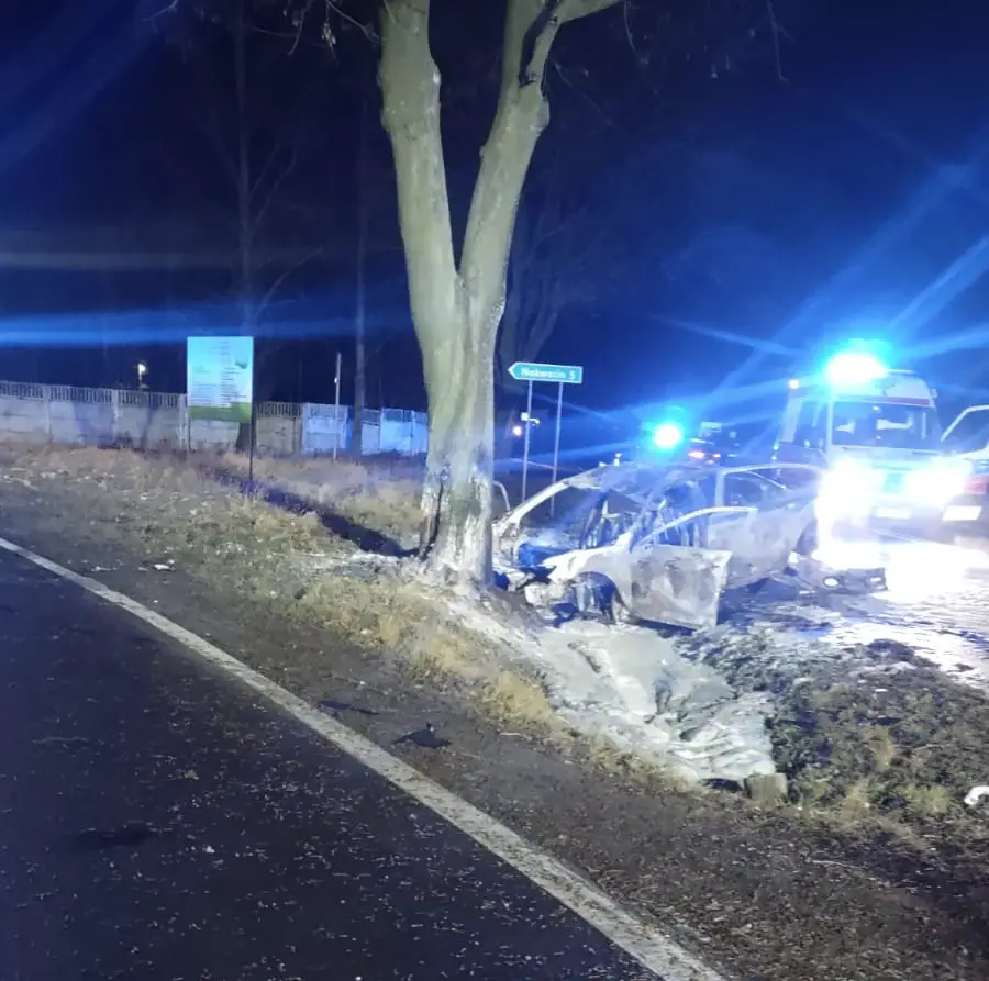 Tragedia w powiecie kaliskim. Samochód z impetem uderzyło w drzewo, stanął w płomieniach. Młody mężczyzna zginął na miejscu.