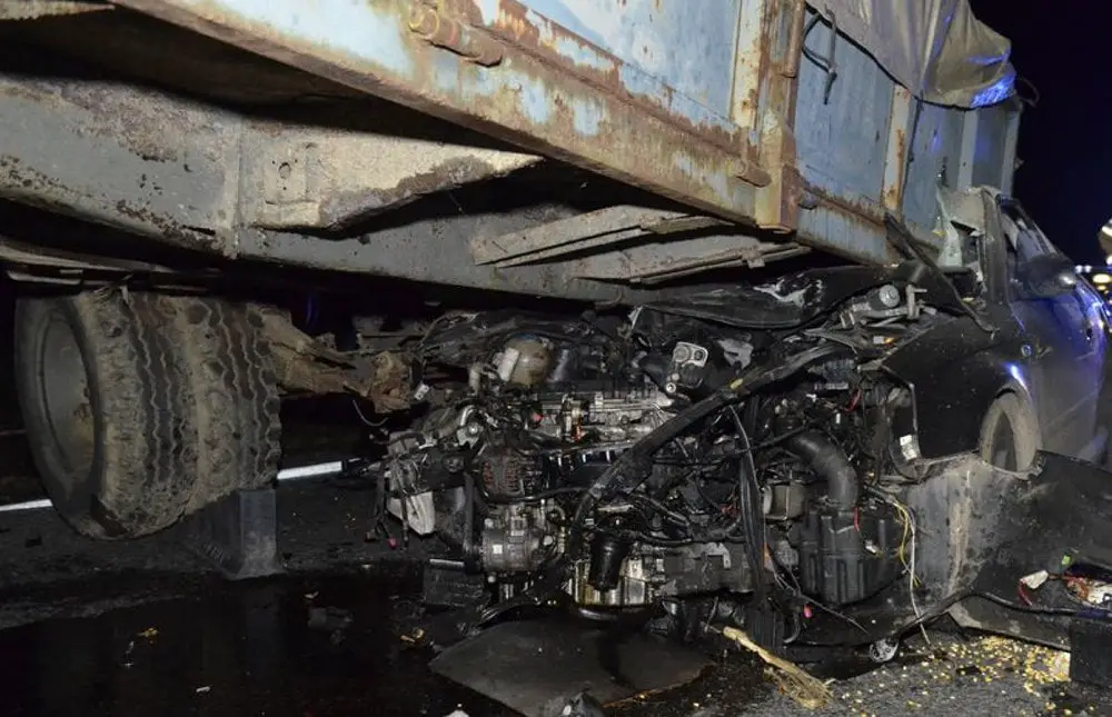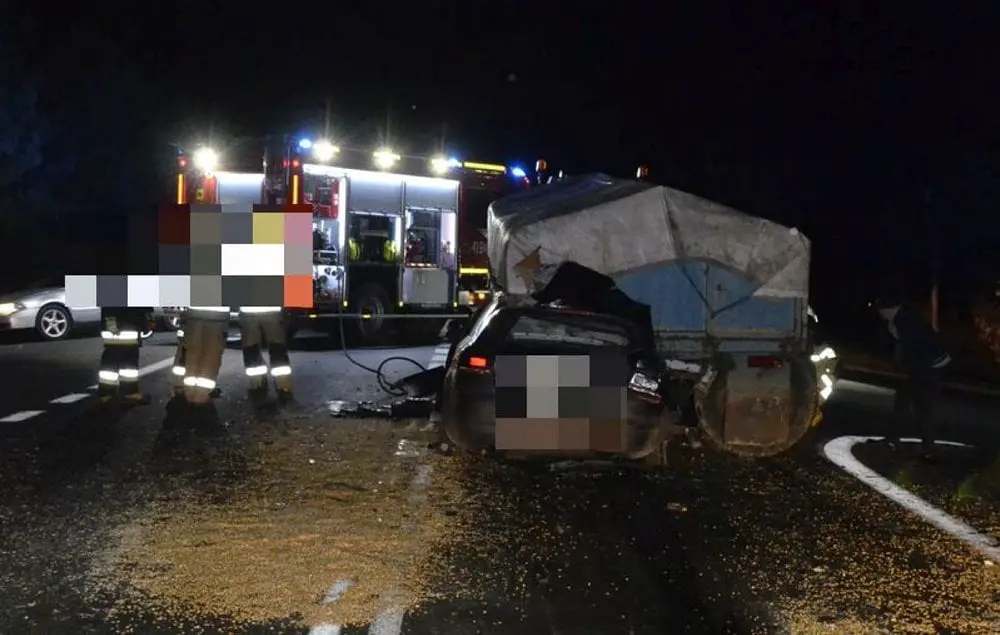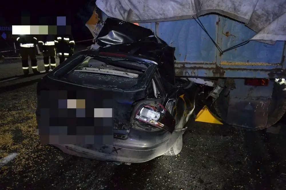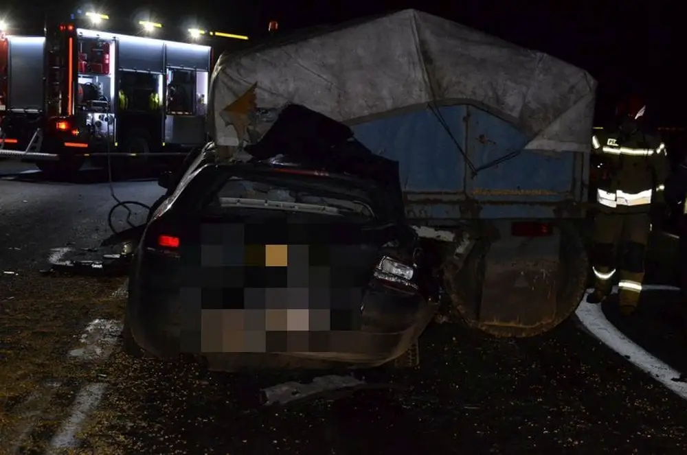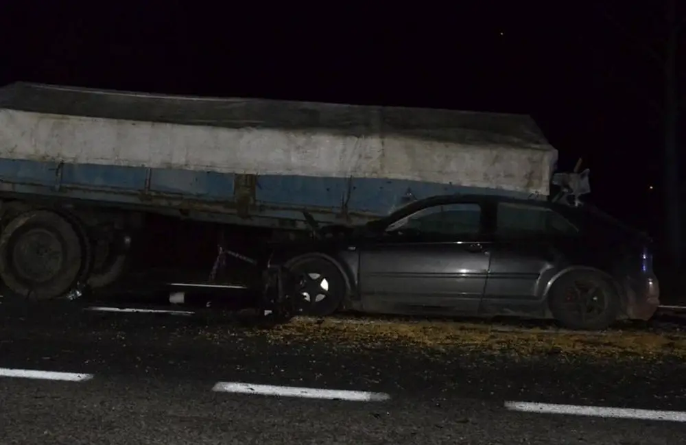 Pijany kierujący audi 24-latek wbił się pod przyczepę ciągnika. Audi z potężna siła uderzyło w przyczepę stroną pasażera.