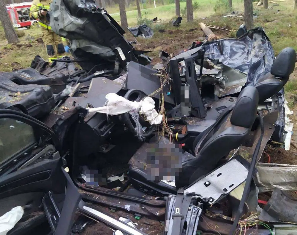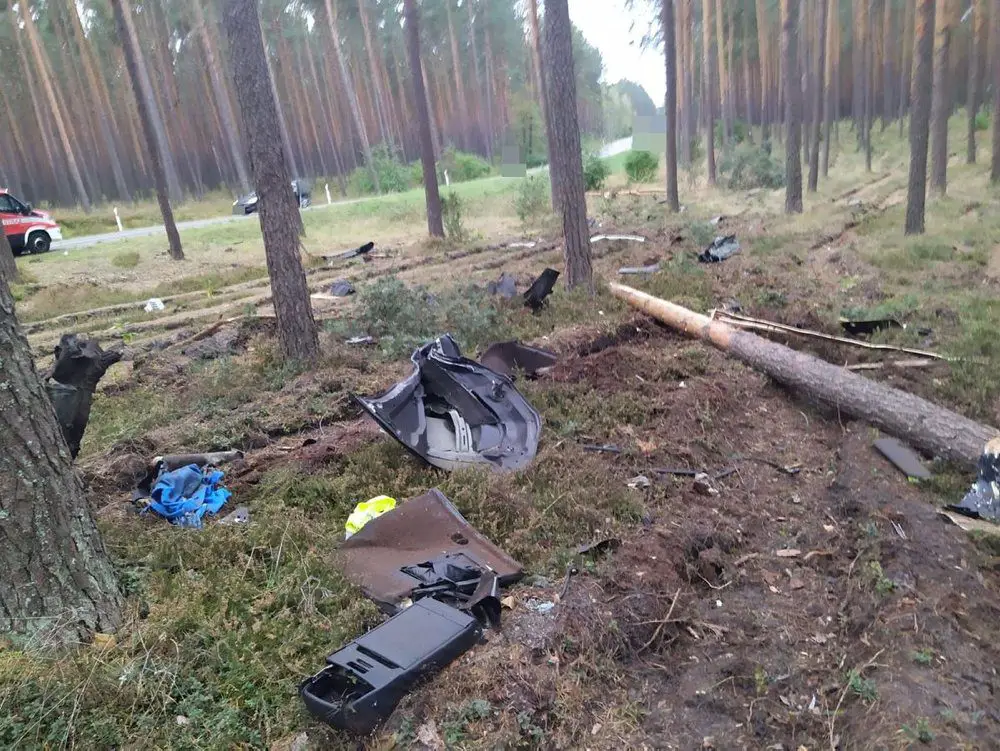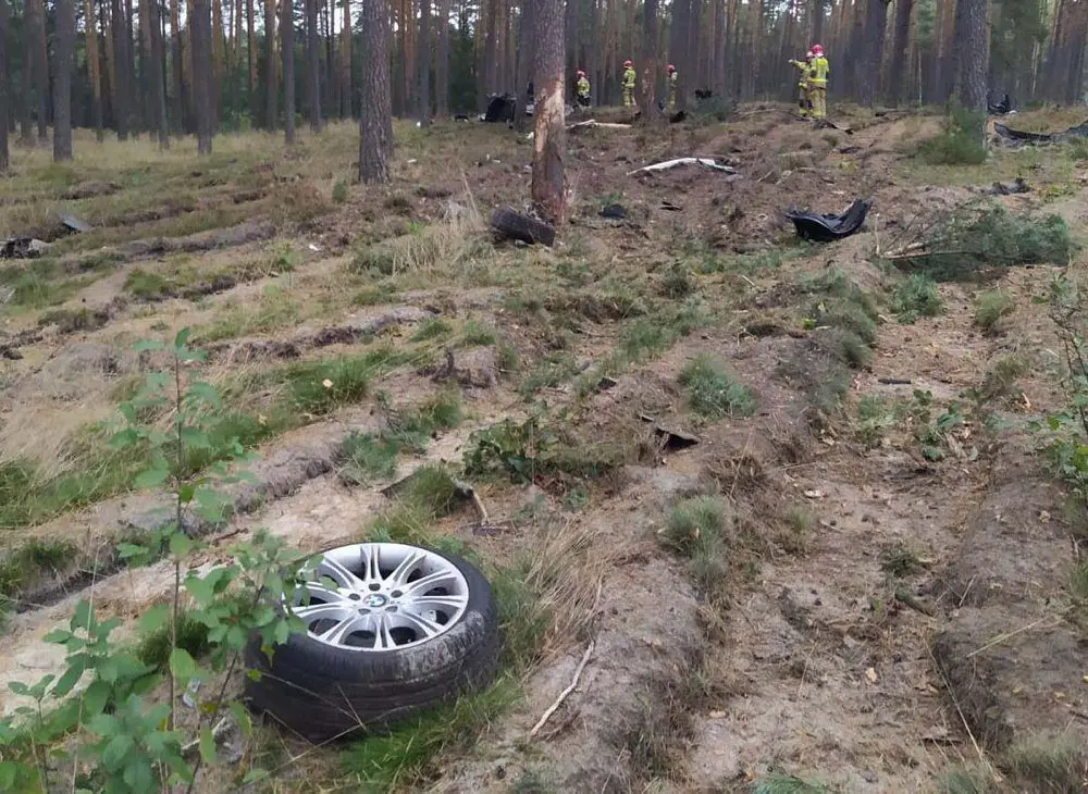 Kierujący BMW z nieustalonych jeszcze chwilę przyczyn zjechał z drogi do lasu. Samochód, którym kierował, z potężną siła uderzał w drzewa. BMW rozpadło się na kawałki. Elementy pojazdu zostały rozrzucone na przestrzeni kilkudziesięciu metrów.