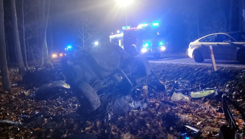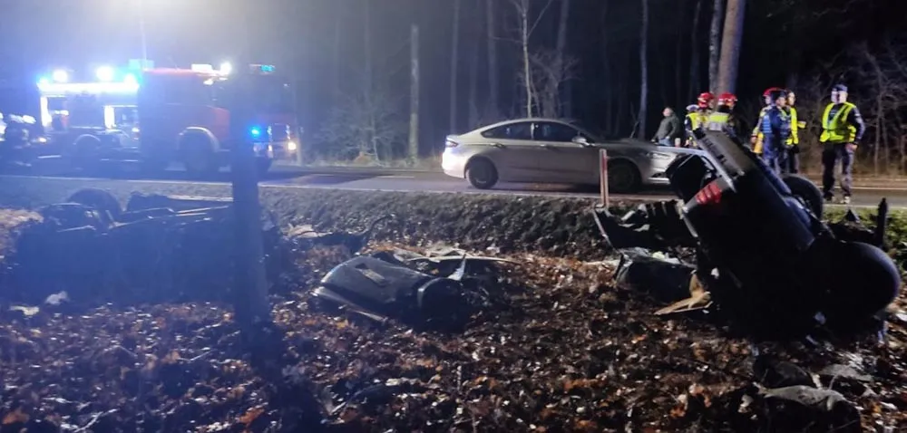 Siła uderzenia w drzewo była tak duża, że mercedes rozpadł się na kawałki. Na miejsce wypadku dojechały służby ratunkowe.