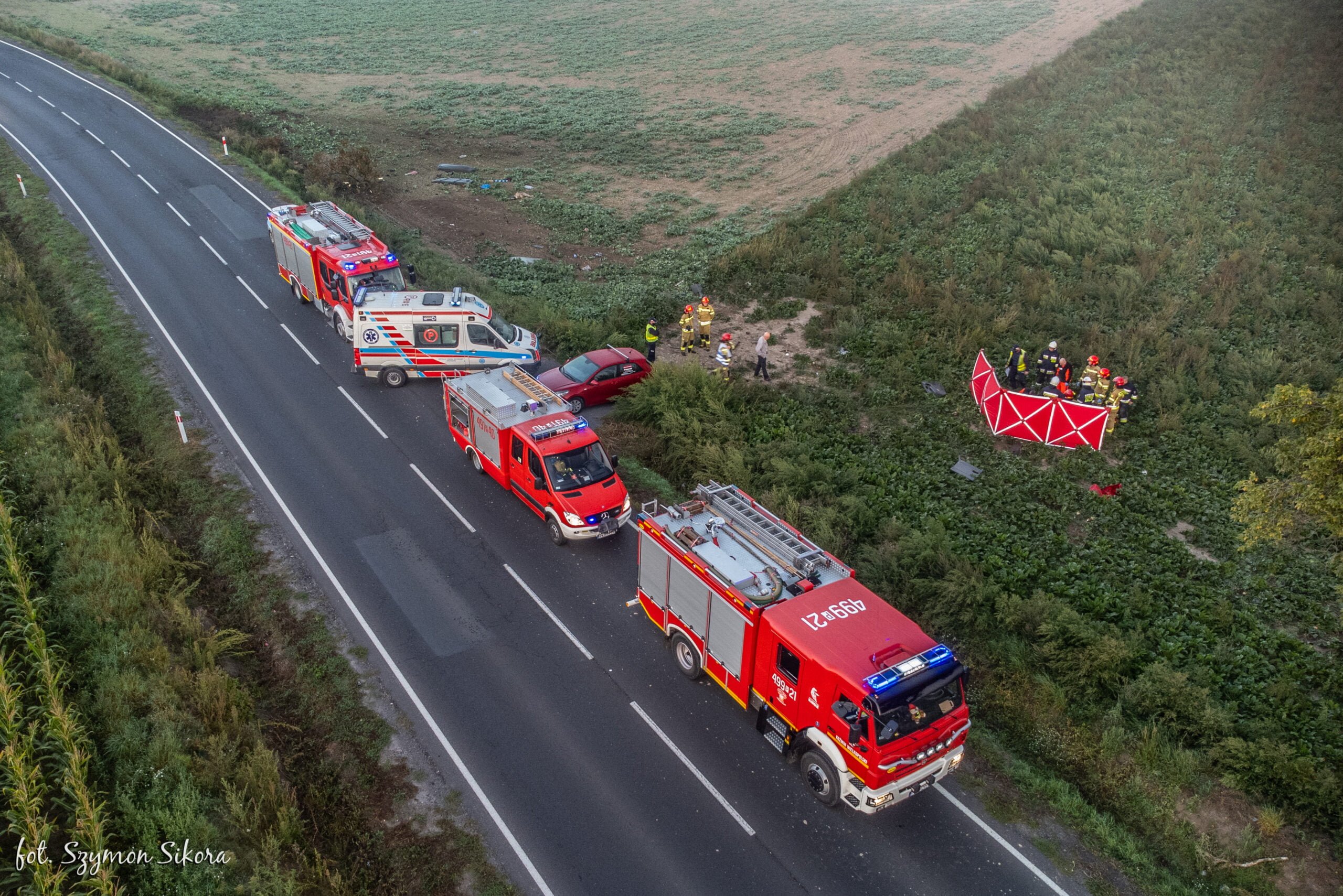 Na miejscu Kierujący Działaniem Ratowniczym ustalił, że rozbity samochód znajduje się poza jezdnią w polu. Kierowca bez funkcji życiowych znajduje się poza pojazdem – informuje st. kpt. Tomasz Patryas rzecznik prasowy Komendy Powiatowej Państwowej Straży Pożarnej w Krotoszynie
