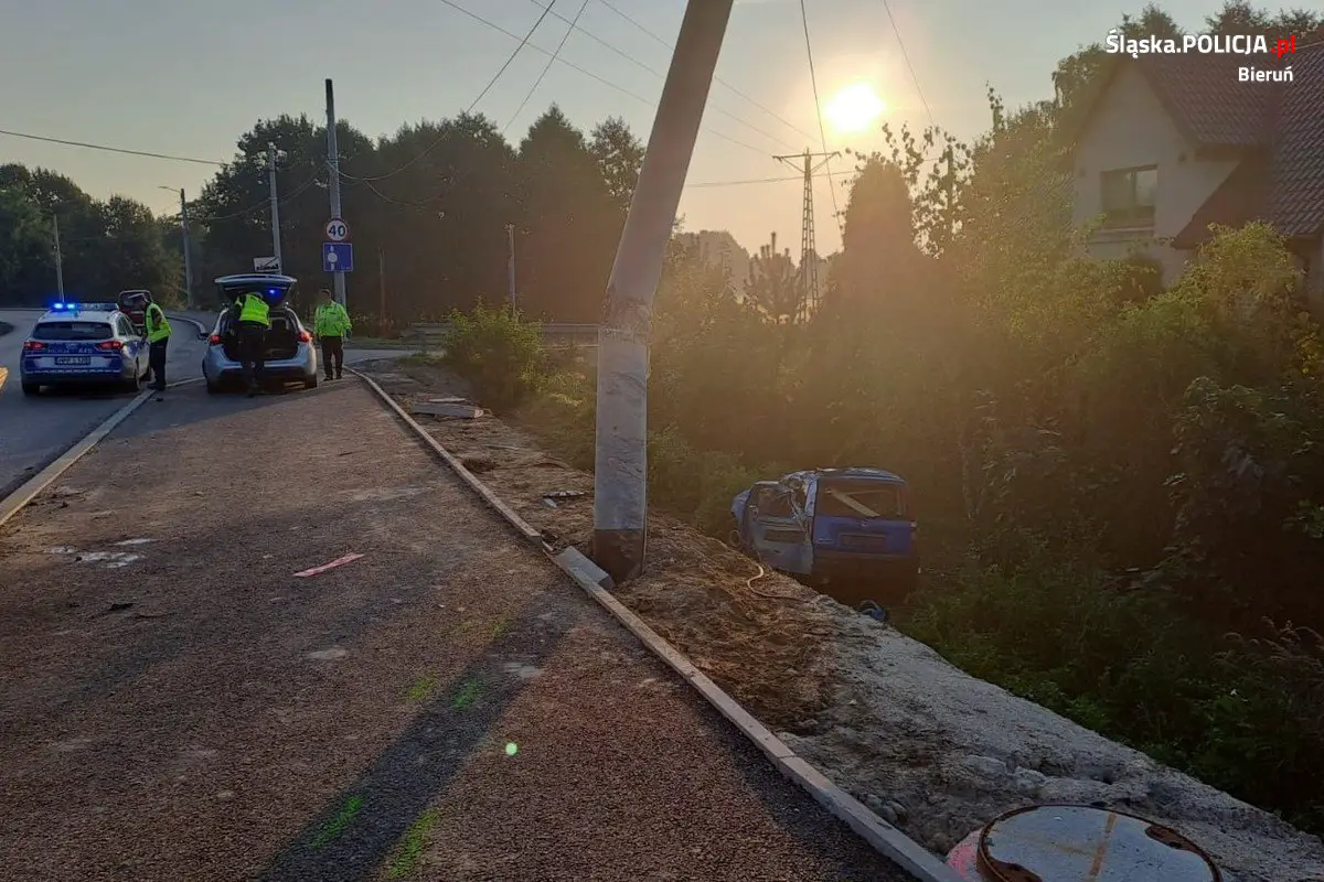Ze wstępnych ustaleń pracujących na miejscu policjantów wynika, że kierujący samochodem osobowym marki Fiat Panda utracił panowanie nad pojazdem, uderzył w słup energetyczny, a następnie dachował.