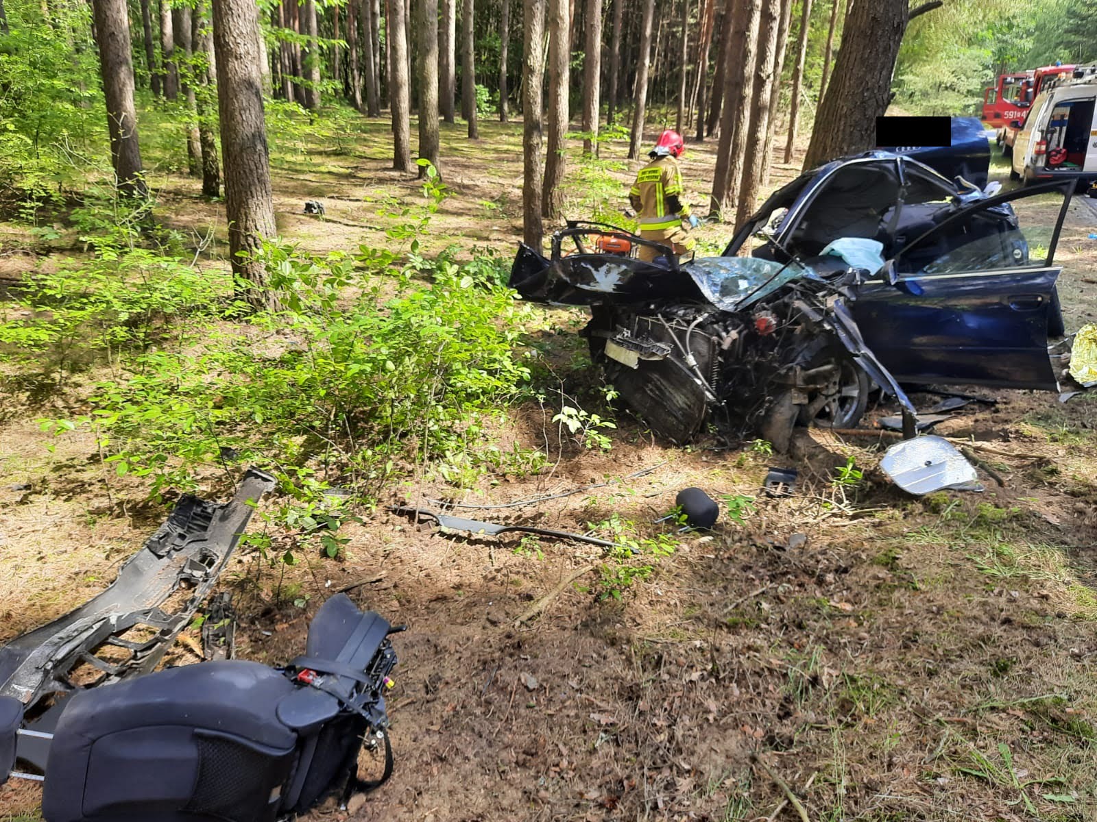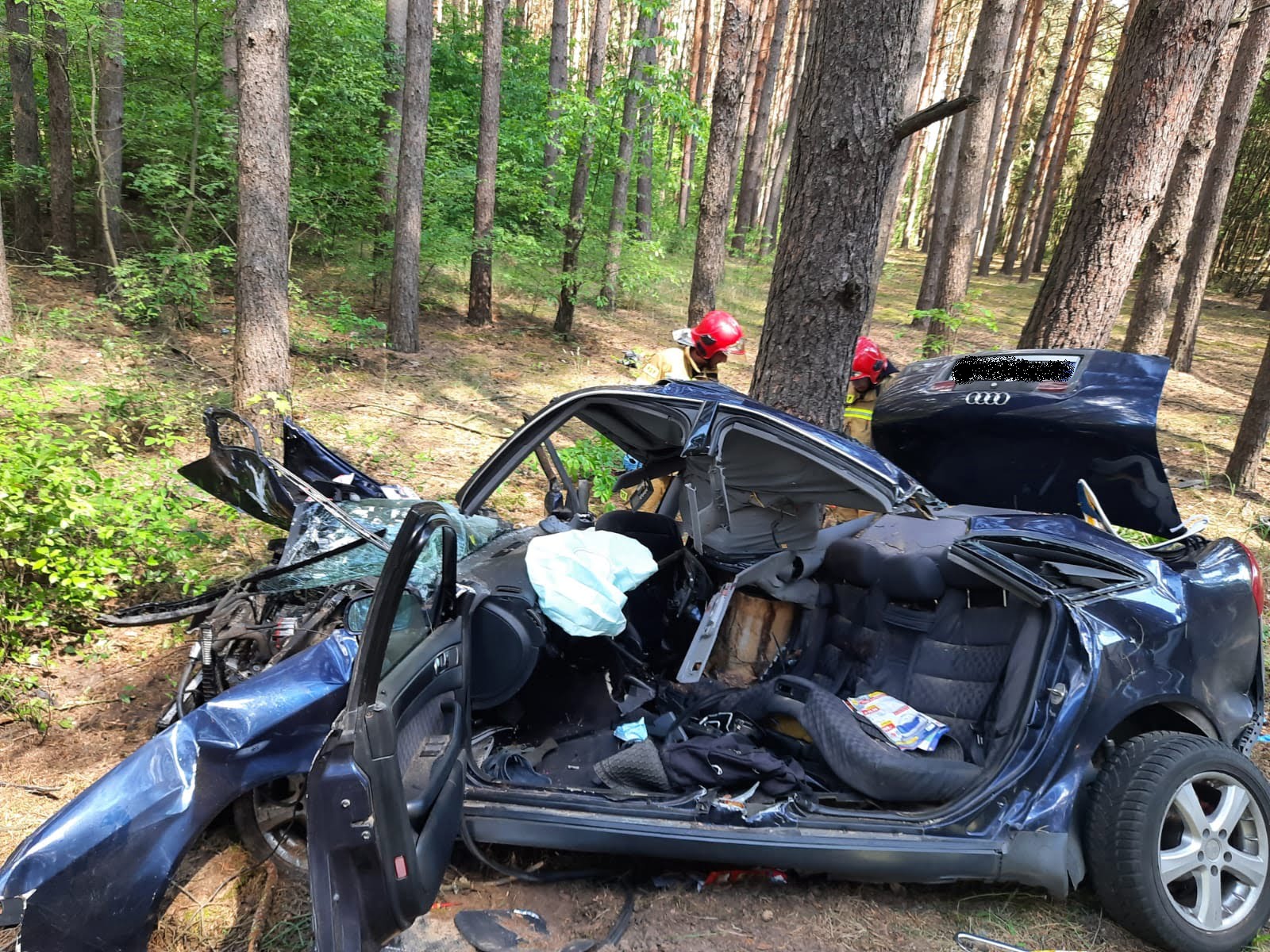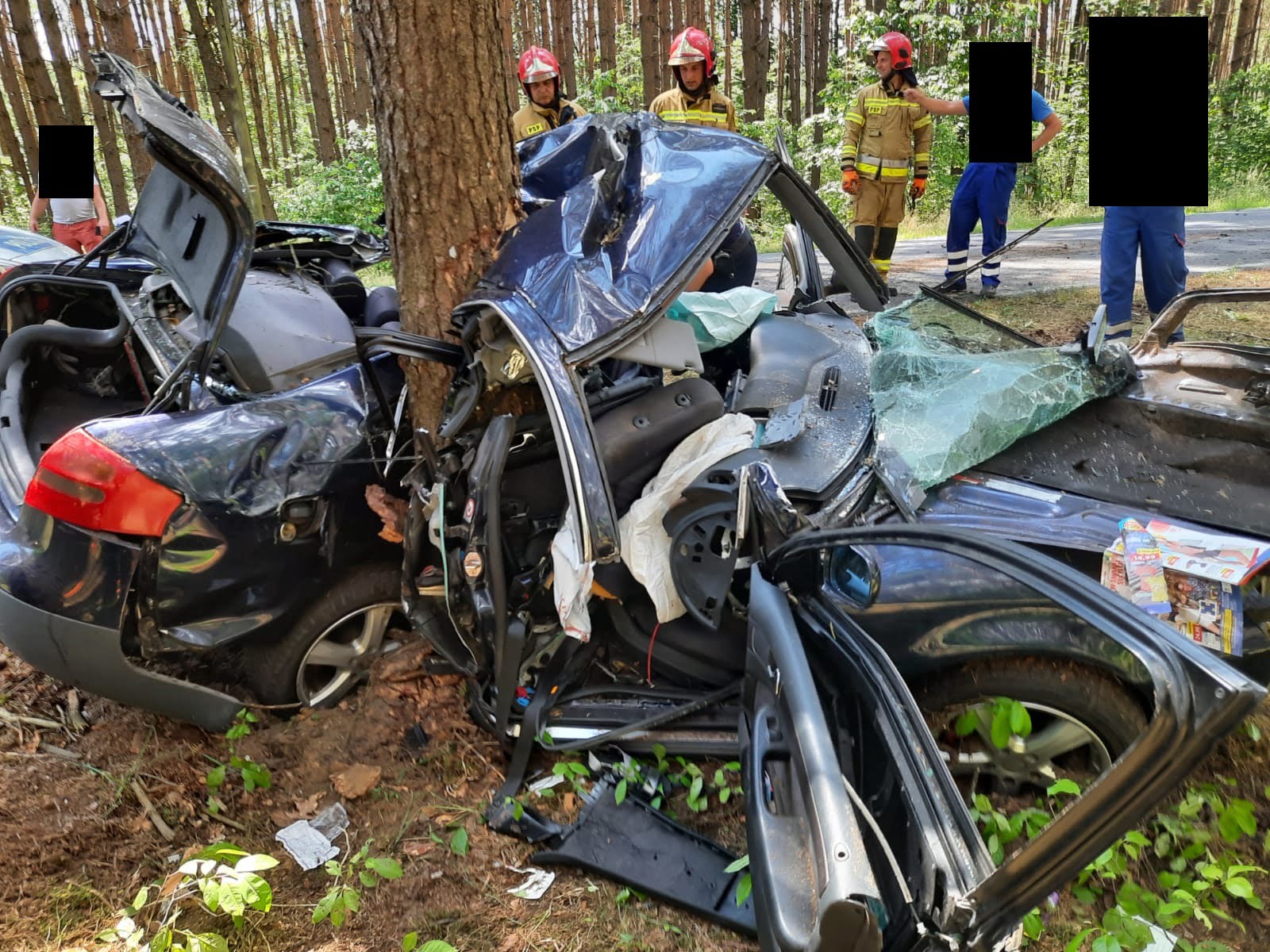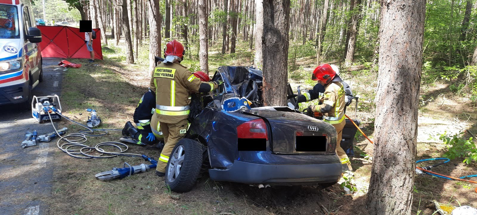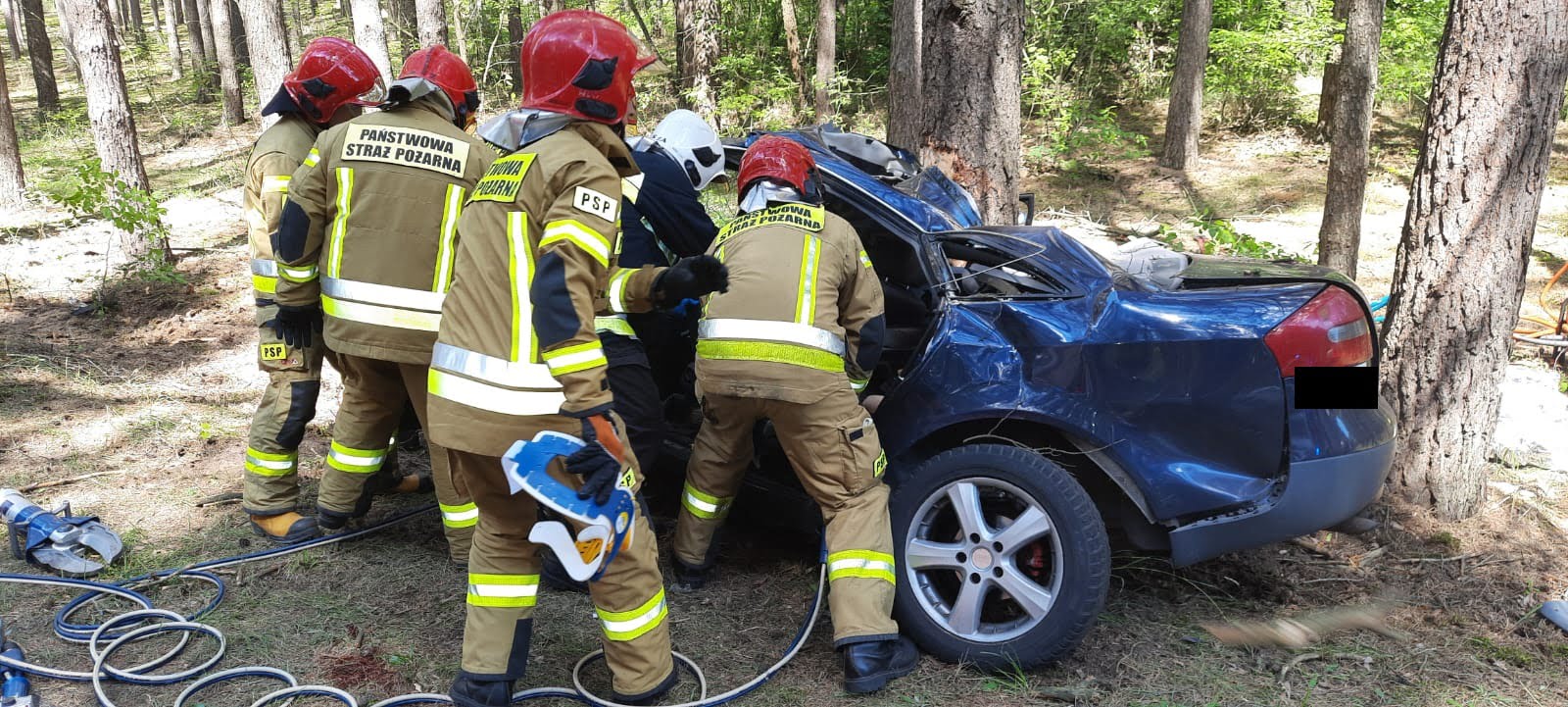 Po dojeździe na miejsce zdarzenia strażacy zastali samochód osobowy, który bokiem uderzył w drzewo. Jedna osoba poszkodowana została wydobyta z pojazdu przez świadków zdarzenia i znajdowała się pod opieką ratowników zespołu ratownictwa medycznego, natomiast dwie osoby poszkodowane znajdowały się uwięzione wewnątrz pojazdu.