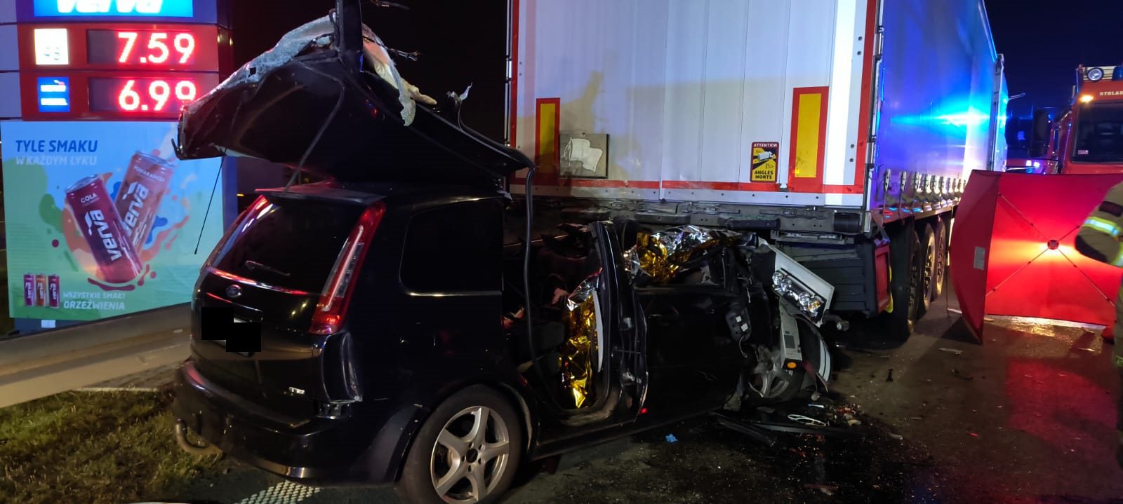 Po dojeździe na miejsce zdarzenia strażacy zastali samochód osobowy marki Ford, który uderzył w tył naczepy pojazdu ciężarowego znajdującego się na zjeździe z autostrady A2 w pobliżu stacji paliw.