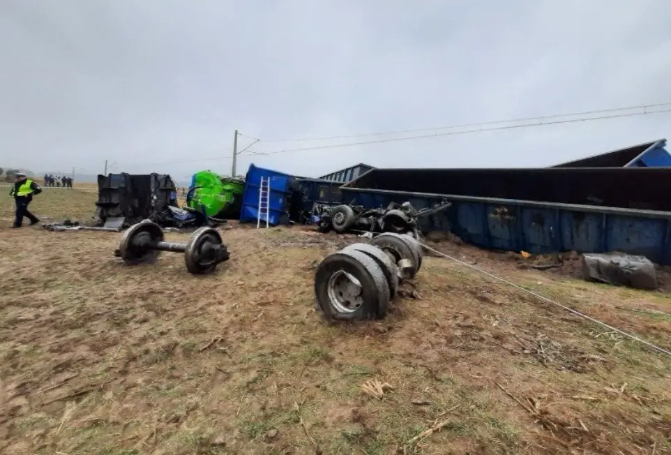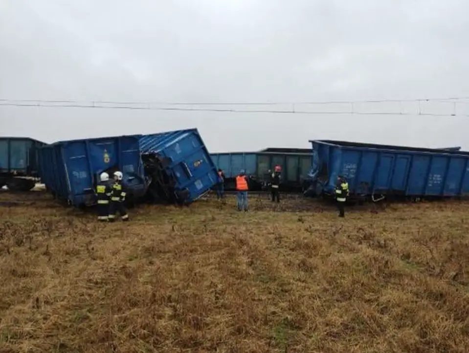 W wyniku zderzenia lokomotywa i osiem pustych wagonów uległo wykolejeniu się. Maszynista został ranny.