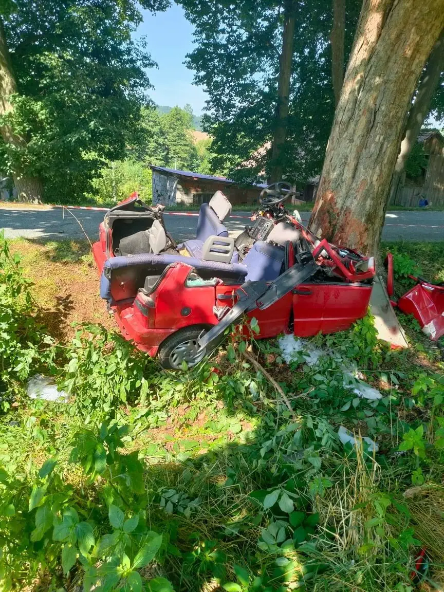 Kierowany przez Marcina fiat wyleciał z drogi. Rozpędzony samochód uderzył w drzewo. Siłą uderzenia była tak duża, że samochód złamał się.