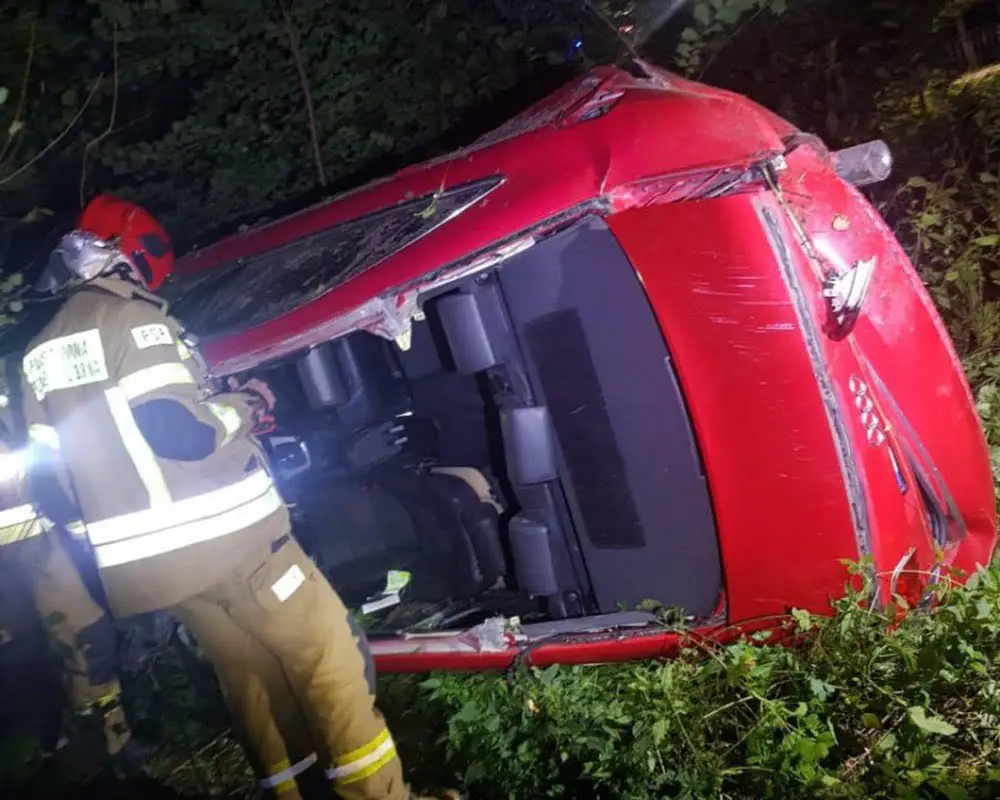 Siła uderzenia w zwierzę była potężna. Audi wypadło z drogi i dachowało Samochód został bardzo mocno rozbity.
