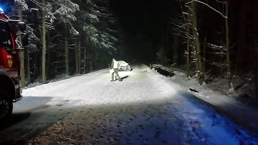 Ze wstępnych ustaleń policji wynika, że kierujący mazdą zaczął wyprzedzać samochody na zaśnieżonej drodze. W trakcie wyprzedzania zderzył się czołowo z nadjeżdżającym z naprzeciwka dodgem.