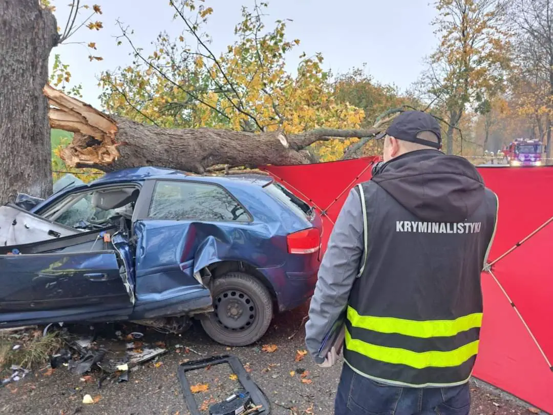 18-letnia kierująca audi nie dostosowała prędkości do warunków drogowych i uderzyła w drzewo. Niestety w wyniku obrażeń kobieta poniosła śmierć na miejscu.