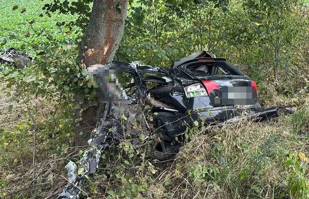 Audi wypadło z drogi i z ogromną siłą uderzyło w drzewo. Siła uderzenia była potężna. Audi zostało rozerwane i rozpadło się na dwie części.