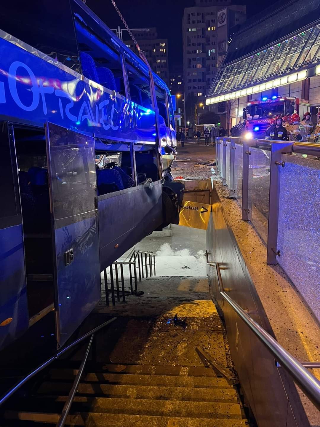 Po przybyciu na miejsce zdarzenia, Kierujący Działaniem Ratowniczym ustalił, że autobus uderzył w samochód osobowy, a następnie wpadł częściowo do przejścia podziemnego. Pojazd wbił się przodem w strop przejścia. Autobusem podróżowały dwie osoby i kierowca. Pasażerowie byli poobijani i nie mogli wyjść z uwagi na zablokowane drzwi. Kierowca autobusu był całkowicie zablokowany między wyrwanym fotelem kierowcy, a deską rozdzielczą oraz kierownicą.