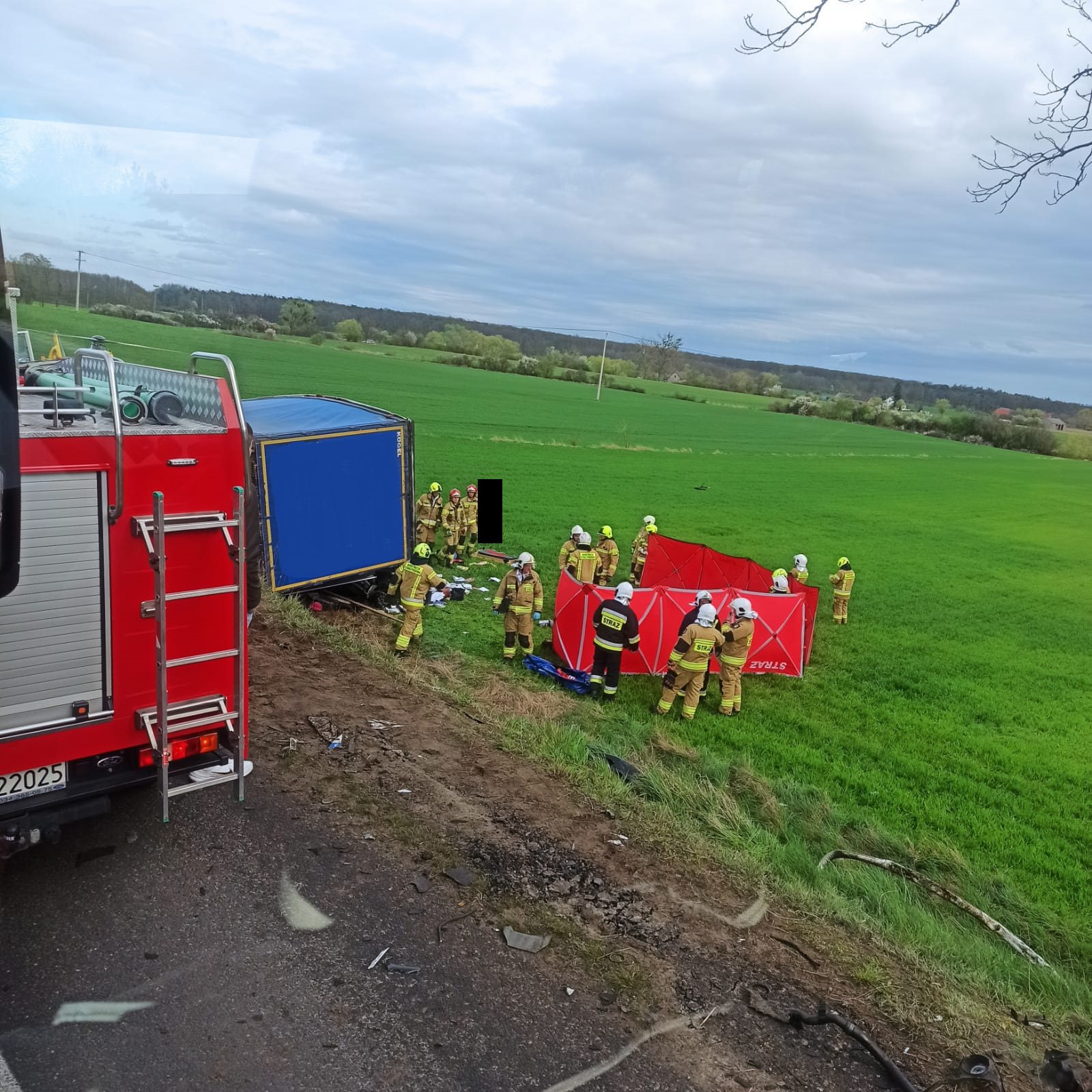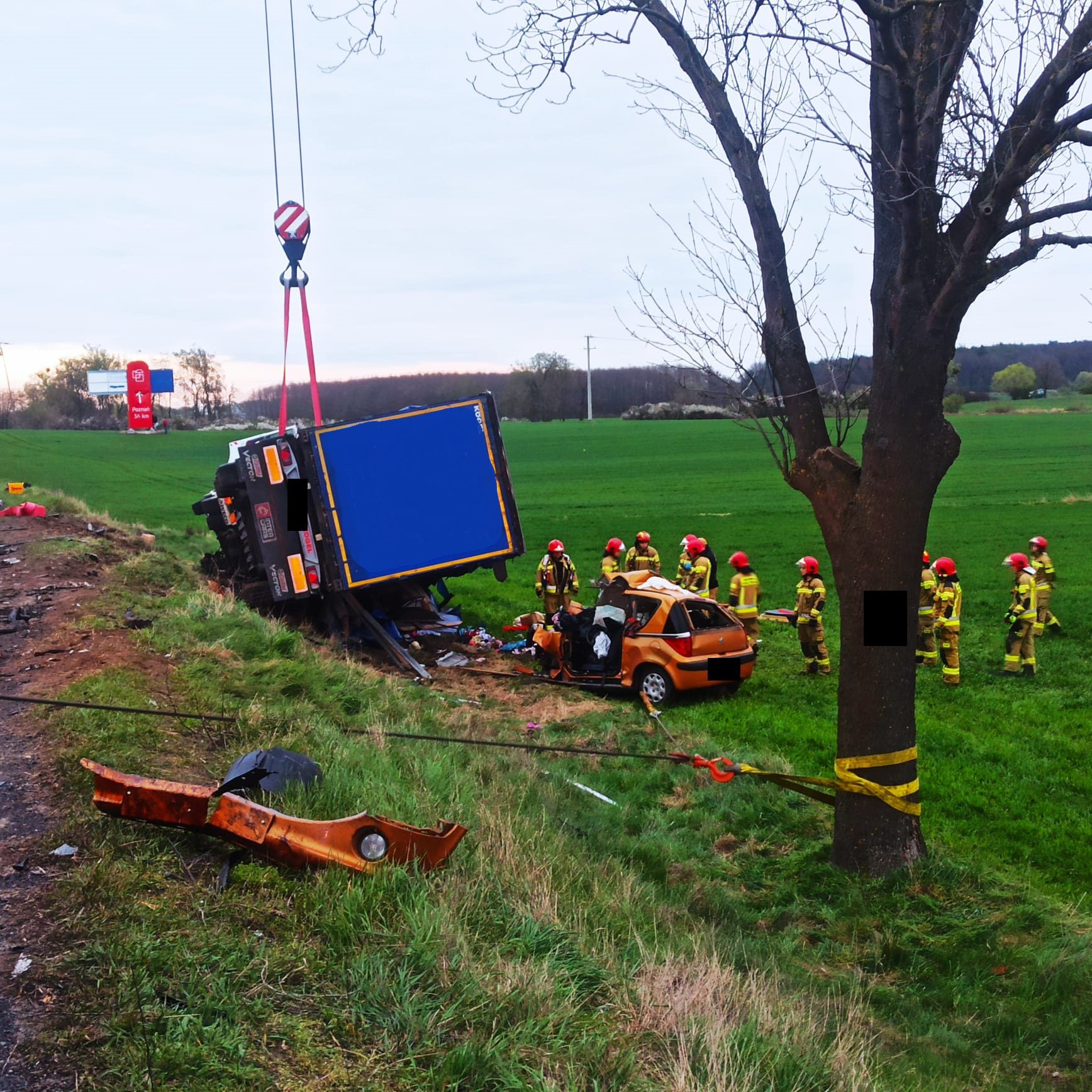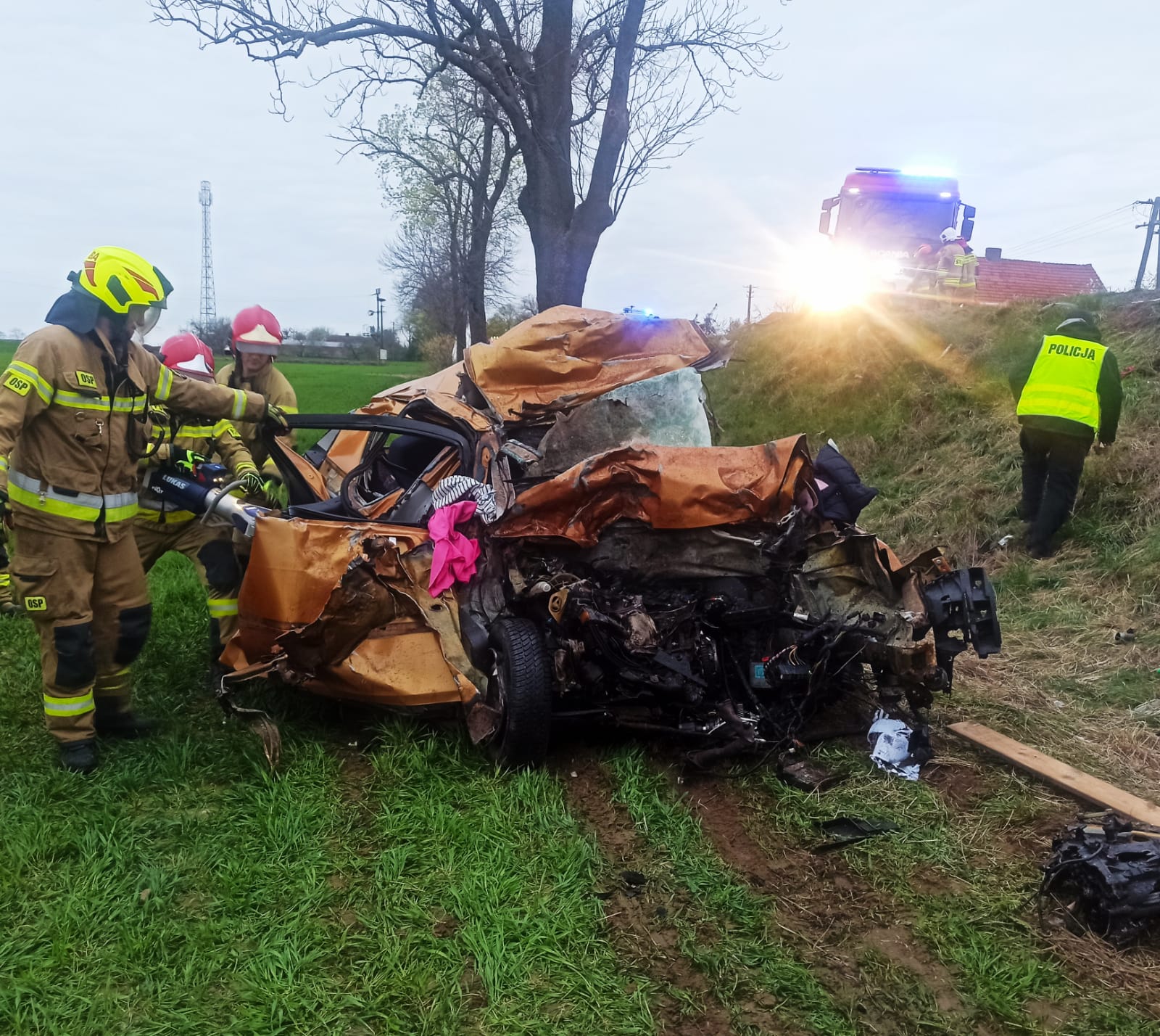Działania straży pożarnej polegały na zabezpieczeniu miejsca zdarzenia, ocenie stanu osoby poszkodowanej, wykonaniu dostępu przy użyciu sprzętu hydraulicznego do osoby poszkodowanej, wydobyciu osoby z pojazdu i przekazaniu pod opiekę ratowników medycznych, wyznaczeniu i zabezpieczeniu lądowiska dla śmigłowca LPR, podniesieniu i wyciągnięciu pojazdu ciężarowego z rowu, rozłączeniu akumulatorów w uszkodzonych pojazdach, sprawdzeniu pojazdu w celu wykluczenia innych osób w samochodzie, pomocy Policji w kierowaniu ruchem drogowym, oświetleniu terenu działań, sorpcji płynów eksploatacyjnych oraz posprzątaniu drogi z pozostałości po wypadku. Niestety pomimo wysiłku ratowników medycznych i lekarza z LPR nie udało się uratować życia 39-letniej kobiety dodaje Kawka