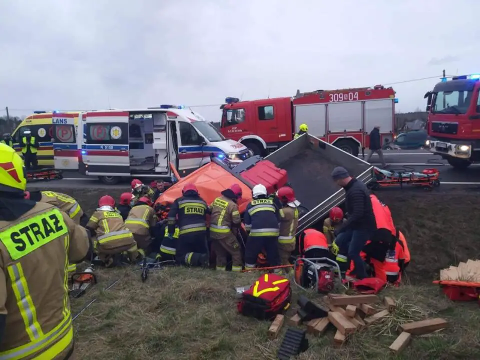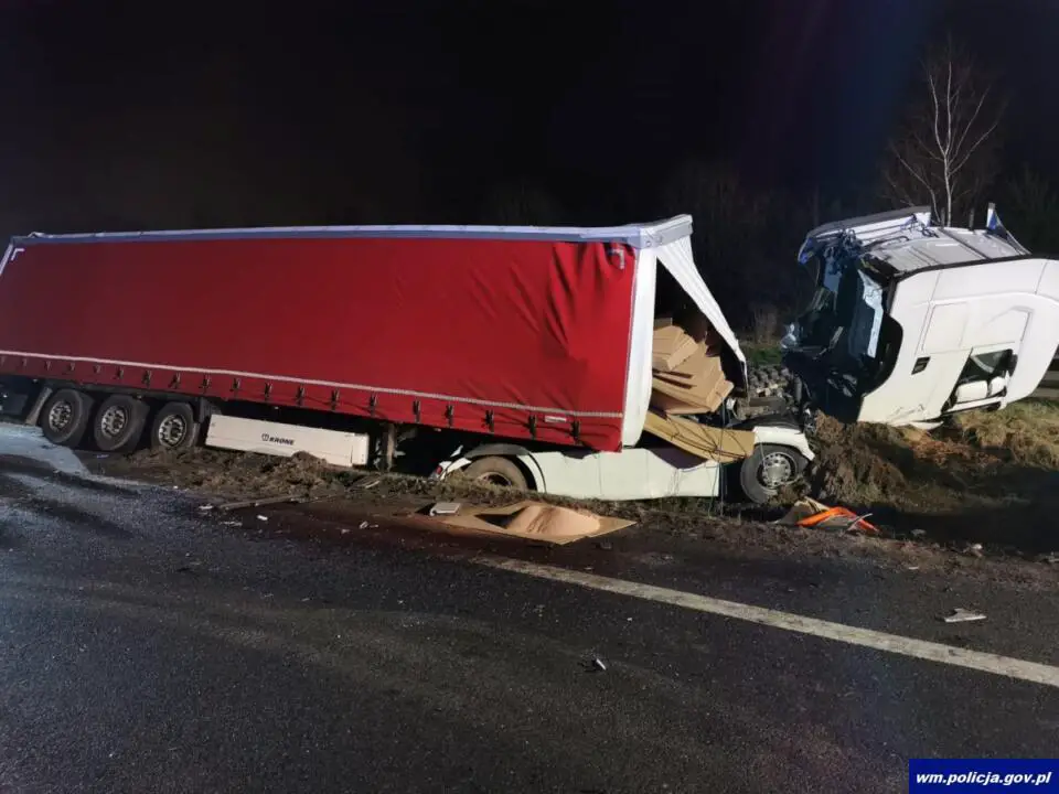 Do makabrycznego wypadku doszło na drodze krajowej nr 16 odcinku Łęgajny-Kaplityny (woj warmińsko-mazurskie). Ford transit uderzył w ciężarówkę i hyundaia. Zginęło trzech mężczyzn. Kobieta i 8-letnie dziecko ranni. Mężczyzna walczy o życie w szpitalu.
