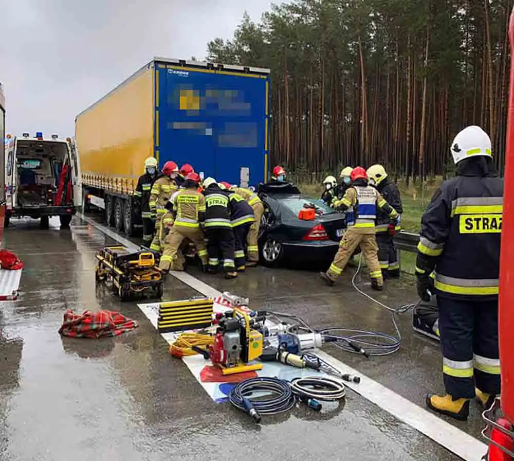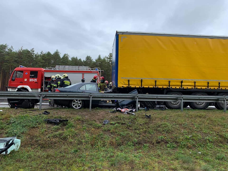 Do wypadku doszło na prawym pasie autostrady. Mercedesa z dużą sił uderzył w tył naczepy ciężarówki. Siła zderzenia była potężna. Mercedes dosłownie wbił się pod naczepę. 82-letni kierowca został zakleszczony w samochodzie.