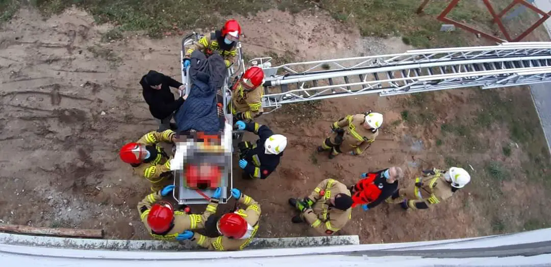 Mężczyzna spadł z rusztowania. Konieczne było wezwanie podnośnika ze straży pożarnej, że względu na brak schodów.
