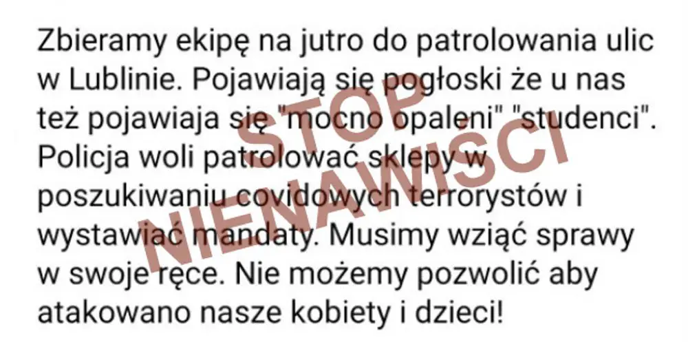 Policjanci z wydziału do walki z cyberprzestępczością w Lublinie zatrzymaliśmy czterech mężczyzn, którzy na portalach społecznościowych nawoływali do przestępstw z nienawiści i ataków na uchodźców. Powielając fake newsy apelowali o organizowanie się do patrolowania miejscowości przygranicznych oraz „zjednoczenia sił w celu oczyszczania miasta”. Grożą im kary po 2 lata więzienia.