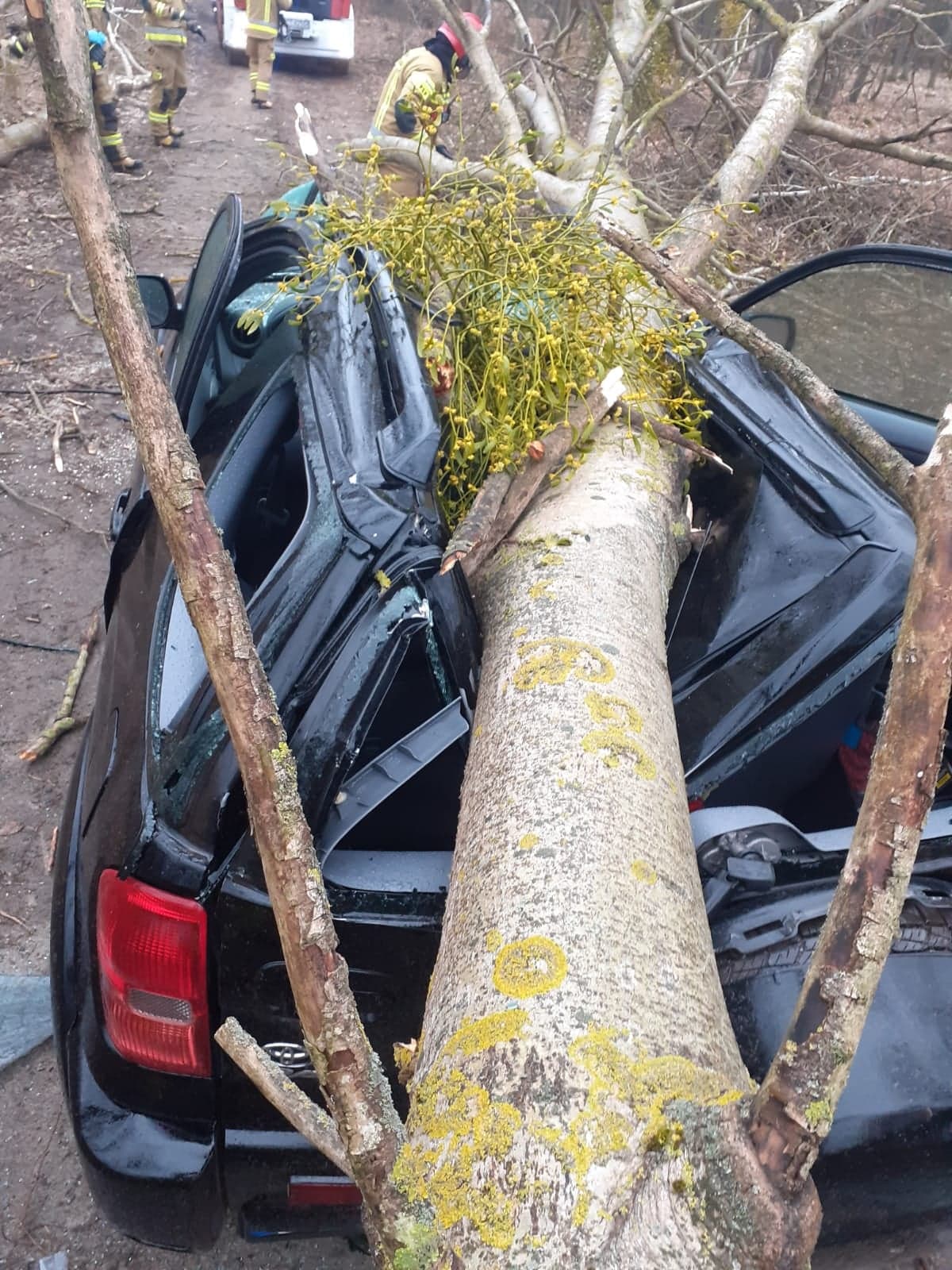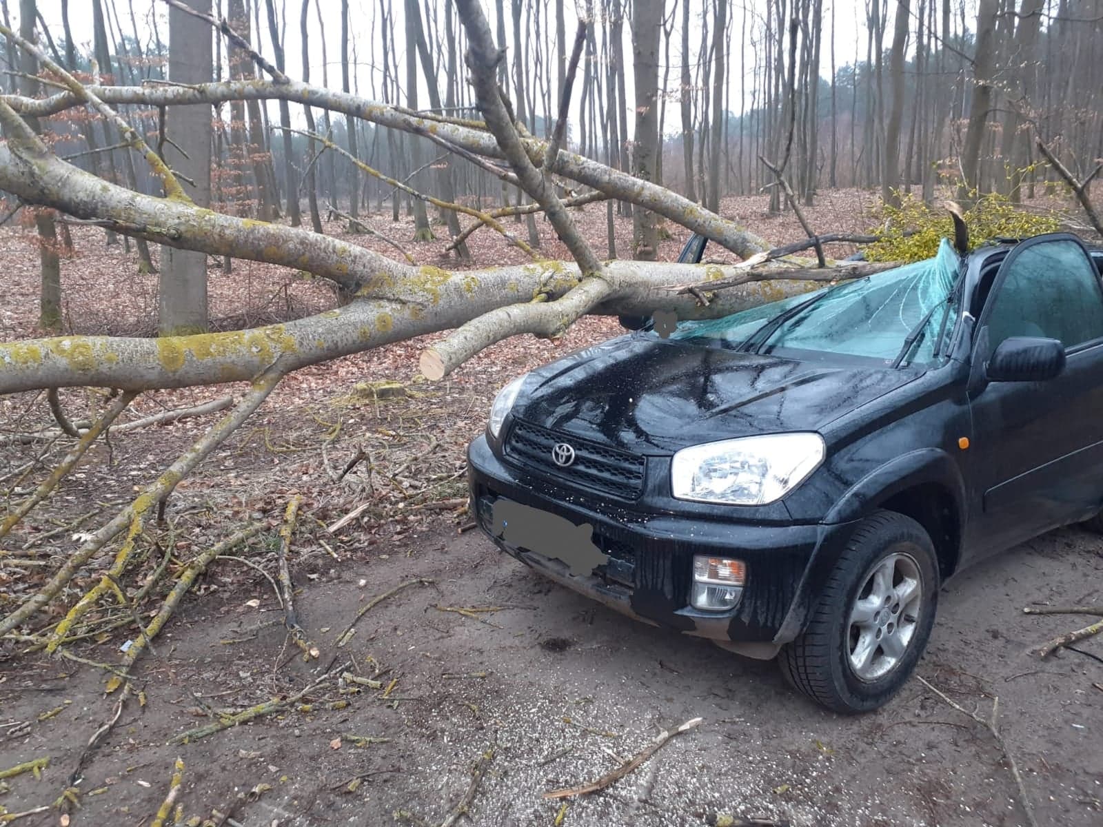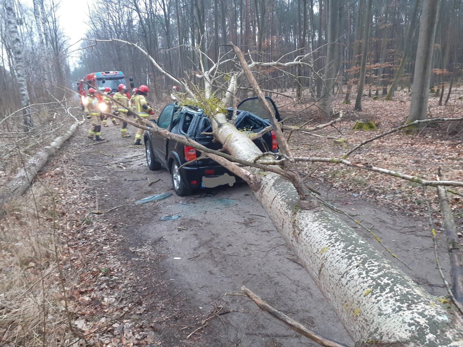 Do działań niezwłocznie zadysponowano 2 zastępy z JRG PSP Trzcianka. Po dojeździe na miejsce strażacy zastali samochód osobowy przygnieciony przez przewrócone drzewo.Kierującemu udało się samodzielnie opuścić pojazd przed przyjazdem strażaków.