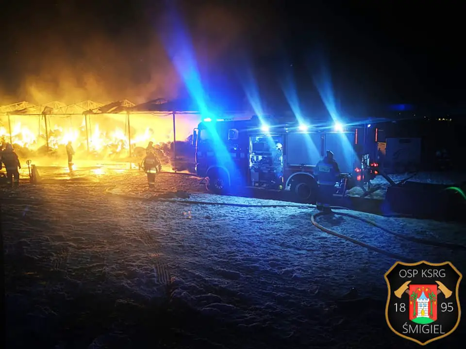 Ogromny pożar na terenie stadniny koni. Spłonęła wiata oraz składowane w niej baloty siana. Do pożaru doszło w Piotrkowicach w powiecie kościańskim w gminie Czempiń.