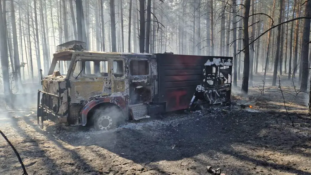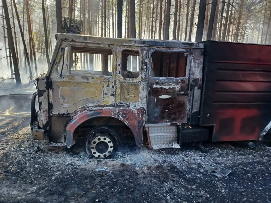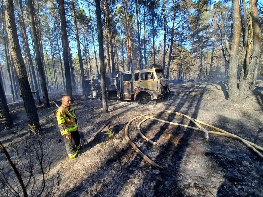 Spłonął niestety samochód gaśniczy OSP Kleszczele, najprawdopodobniej strażacy nie zdążyli odjechać po przerzuceniu przez wiatr ognia w pobliże wozu.