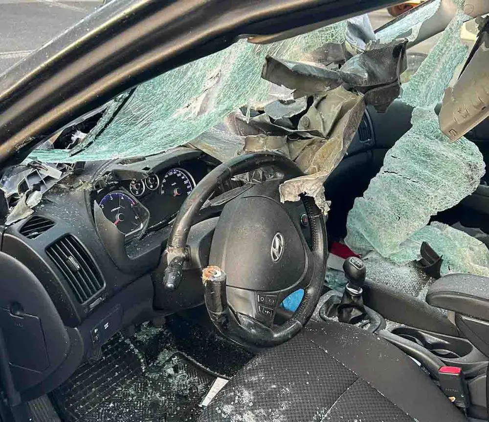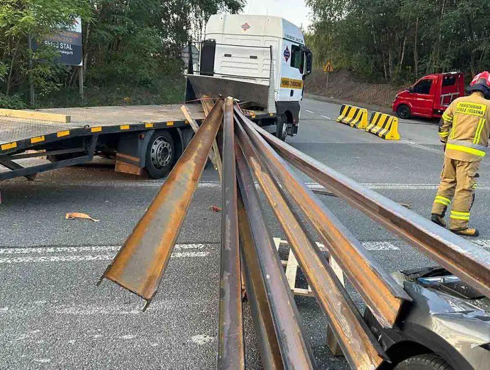 Podczas jazdy szyny zsunęły się z naczepy. Wtedy nabiło się na nie kierujący osobówką. Stalowe ceowniki wbiły się do samochodu przez przednią szybę.
