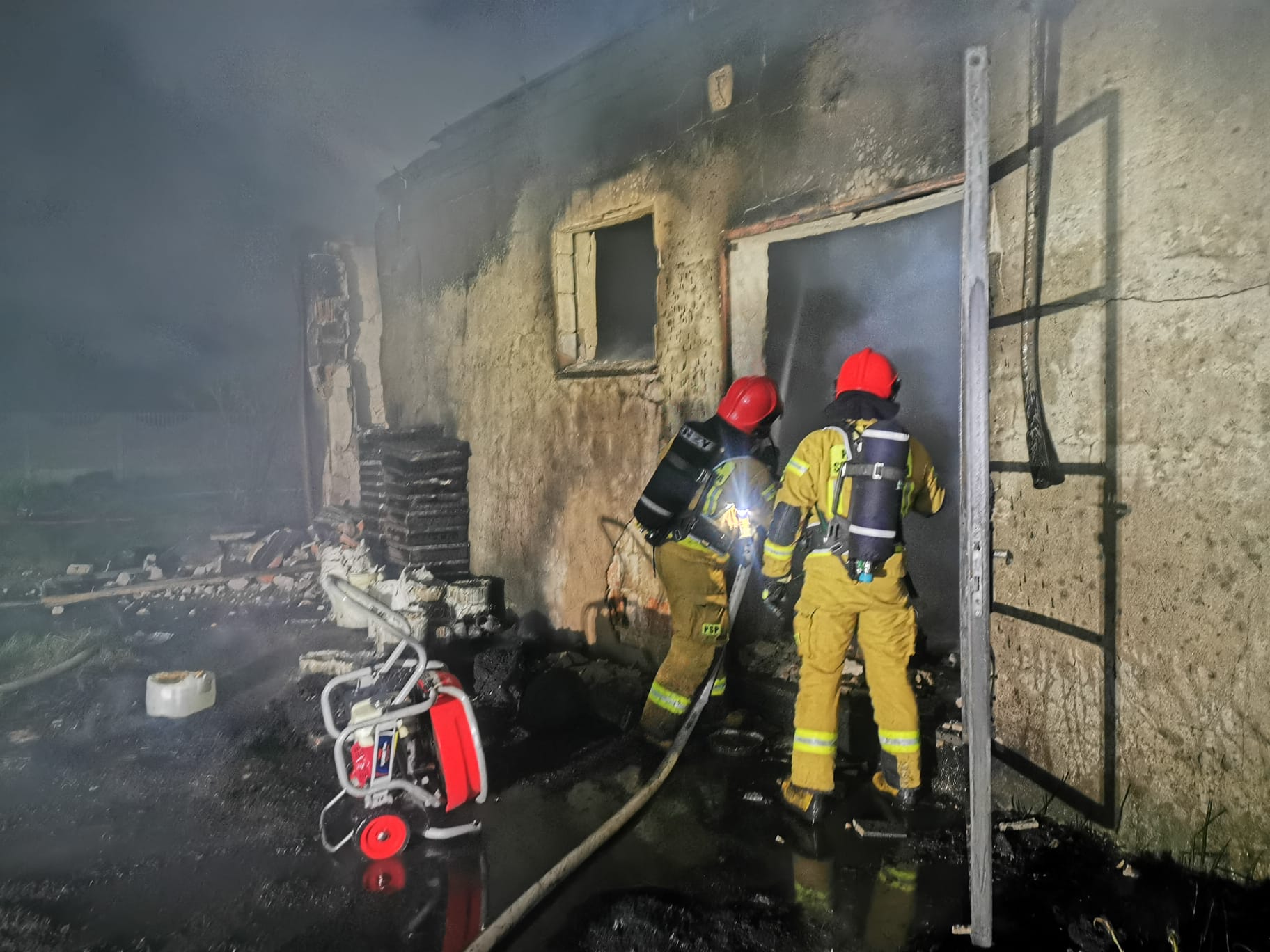 Po przyjeździe na miejsce zdarzenia w rozpoznaniu ustalono, że pożarem objęte są pomieszczenia budynku gospodarczego. Zniszczenia budynku wskazują na naruszenie konstrukcji, doszło do zawalenia się czyści stropu do środka budynku. Brak osób poszkodowanych. Z relacji właściciela brak potencjalnych osób znajdujących się wewnątrz budynku.