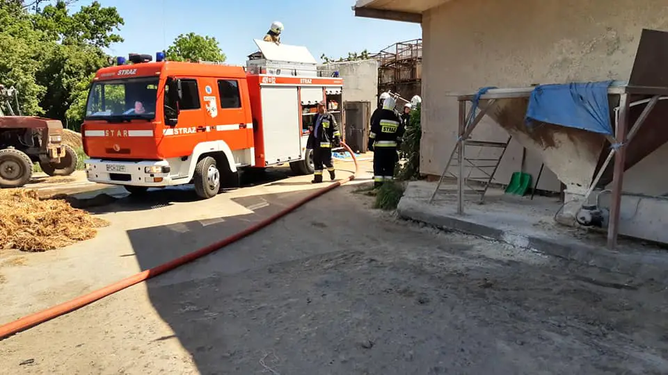 Do działań strażaków należało zabezpieczenie miejsca zdarzenia, ratownicy,którzy byli zabezpieczeni w sprzęt Ochrony Układu Oddechowego podali jeden prąd wody w natarciu na pożar. Po ugaszeniu ognia przystąpiono do wynoszenia na zewnątrz spalonych elementów i przelewania ich wodą. W spalonej części budynku zdemontowano od wewnątrz fragment dachu. Pracownicy zakładu pootwierali okna oraz zwiększyli wydajność wentylacji w pomieszczeniach, w których znajdowały się zwierzęta (nie było potrzeby ich ewakuacji). Przypuszczalną przyczyną pożaru była iskra z pieca, która przy silnym wietrze spadła na baloty siana (składowane przy drzwiach do hali) i zapaliła je. Na miejsce zdarzenia przybył również patrol Policji.