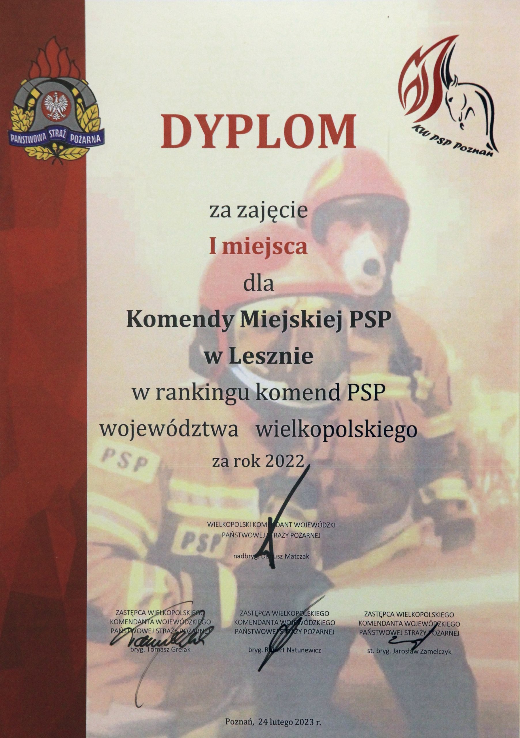 Po obszernym podsumowaniu działalności Państwowej Straży Pożarnej województwa wielkopolskiego w 2022 roku przedstawionym przez Wielkopolskiego Komendanta Wojewódzkiego nadbryg. Dariusza Matczaka oraz działalności Szkoły Aspirantów PSP w Poznaniu przez st. bryg. Macieja Zdęgę Komendanta SA PSP w Poznaniu, miało miejsce podsumowanie działalności komend miejskich i powiatowych PSP woj. wielkopolskiego w 2022 roku. W prowadzonym corocznie od wielu lat rankingu wielkopolskich komend miejskich i powiatowych wyróżniono działalność Komendy Miejskiej PSP w Lesznie, której przyznano pierwsze miejsce, w imieniu leszczyńskich strażaków wyróżnienie odebrał mł. bryg. Sebastian Kozłowski – Komendant Miejski PSP w Lesznie. Drugie miejsca zajęła Komenda Powiatowa PSP w Pile , a trzecie Komenda Powiatowa PSP w Ostrowie Wlkp.