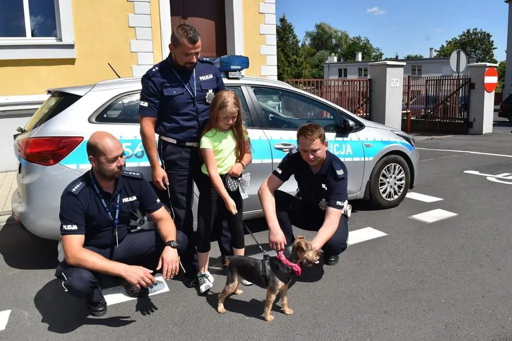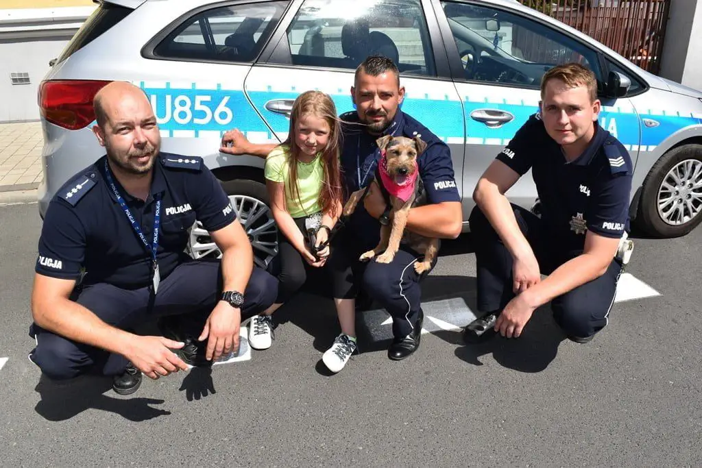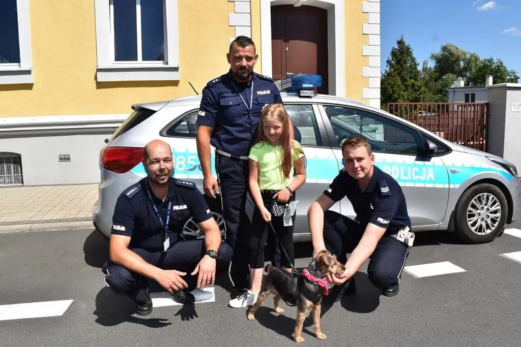 30 lipca br. Cynka odwiedziła śremskich policjantów, którzy uratowali jej życie. Od razu poznała tych, którzy jej pomogli i z radością ruszyła, aby się z nimi przywitać. Była wesoła i otwarta. Zauważyliśmy też, iż jest bardzo zadbana. Teraz jeszcze bardziej jest w typie terierka. Lubi spędzać czas z Matyldą córeczką Łukasza Marciniaka i długie spacery z całą, swoją nową rodziną.