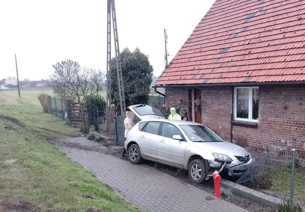 Dyżurny komendy policji w Śremie został powiadomiony o tym, że w Drzonku kierujący mazdą wjechał w ogrodzenie domu. Na miejsce szybo dojechała drogówka.