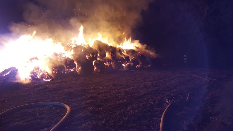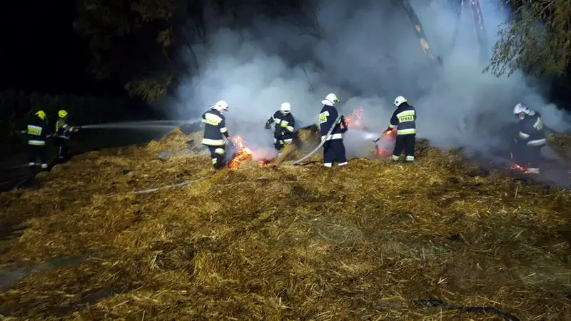 Po dojeździe pierwszych zastępów na miejsce zastano całkowicie objęte ogniem dwa stogi słomy w balotach oraz zagrożony pożarem las oddalony o ok. 30m. Innym dodatkowym zagrożeniem dla strażaków była linia energetyczna przebiegająca wzdłuż ściany lasu. Działania polegały na zabezpieczeniu i oświetleniu terenu akcji, podaniu dwóch prądów wody na palące się balot słomy oraz dwóch prądów wody w obronie zagrożonego drzewostanu. Dalsze działania jak w większości tego typu pożarów polegały na sukcesywnym rozciąganiu i dogaszaniu balotów objętych pożarem.