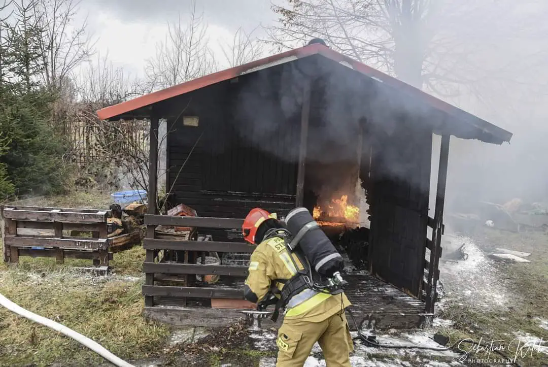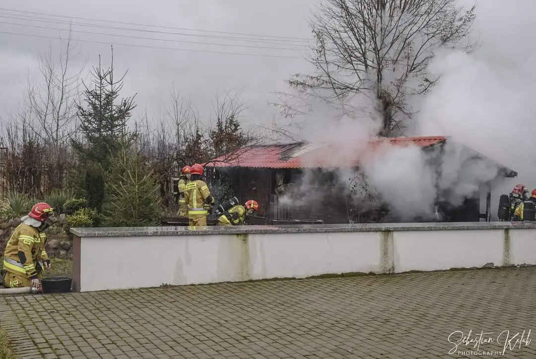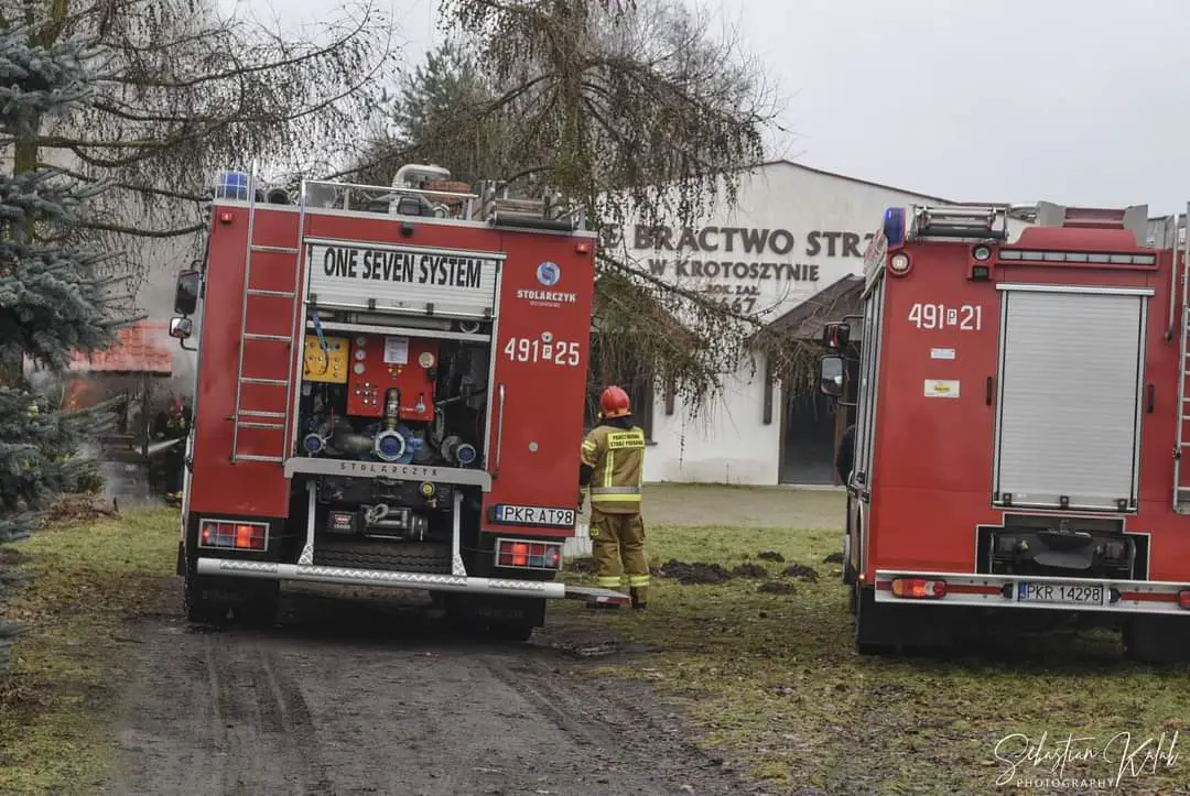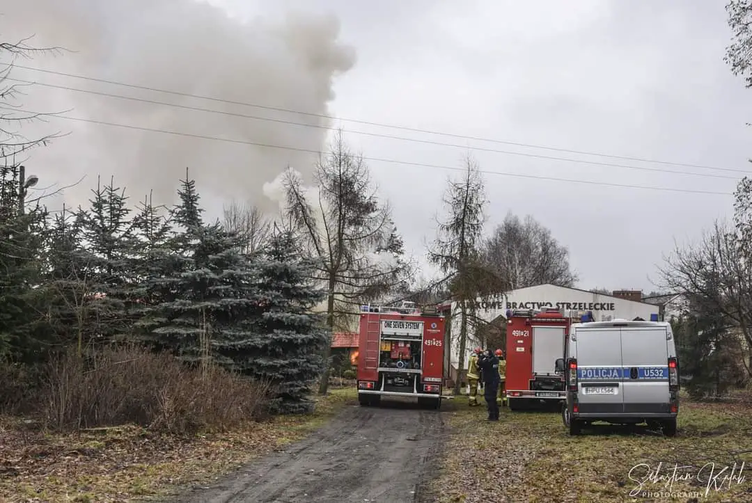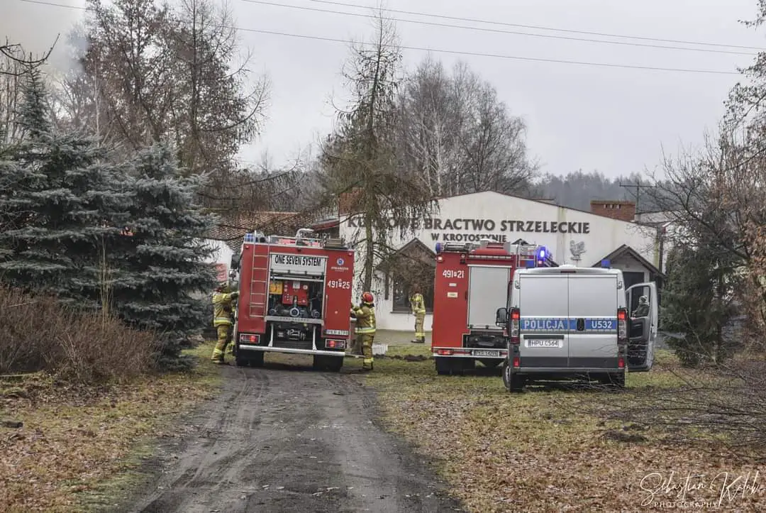 W miejscowości Krotoszyn na strzelnicy Braci Kurkowych doszło do pożaru budynku gospodarczego. Strażacy na miejscu. Pożar wybuch w niedzielę 24 stycznia o godzinie 13:09