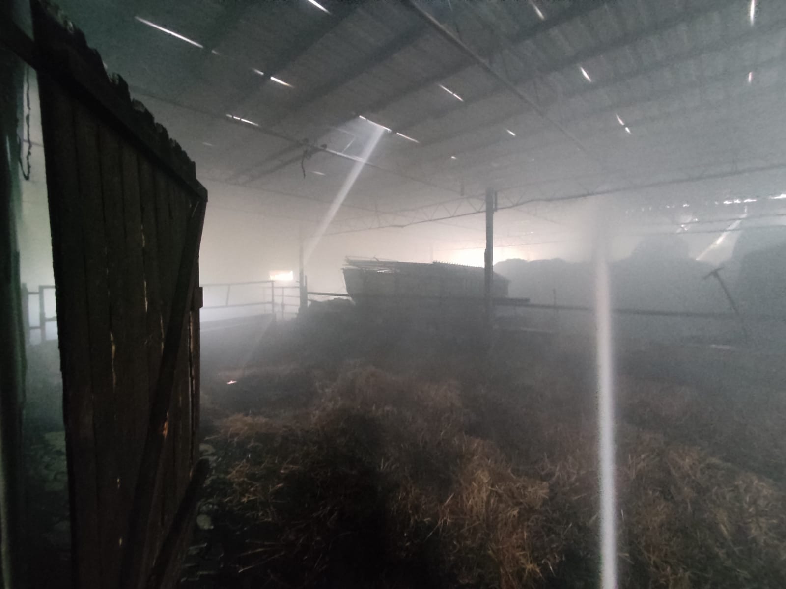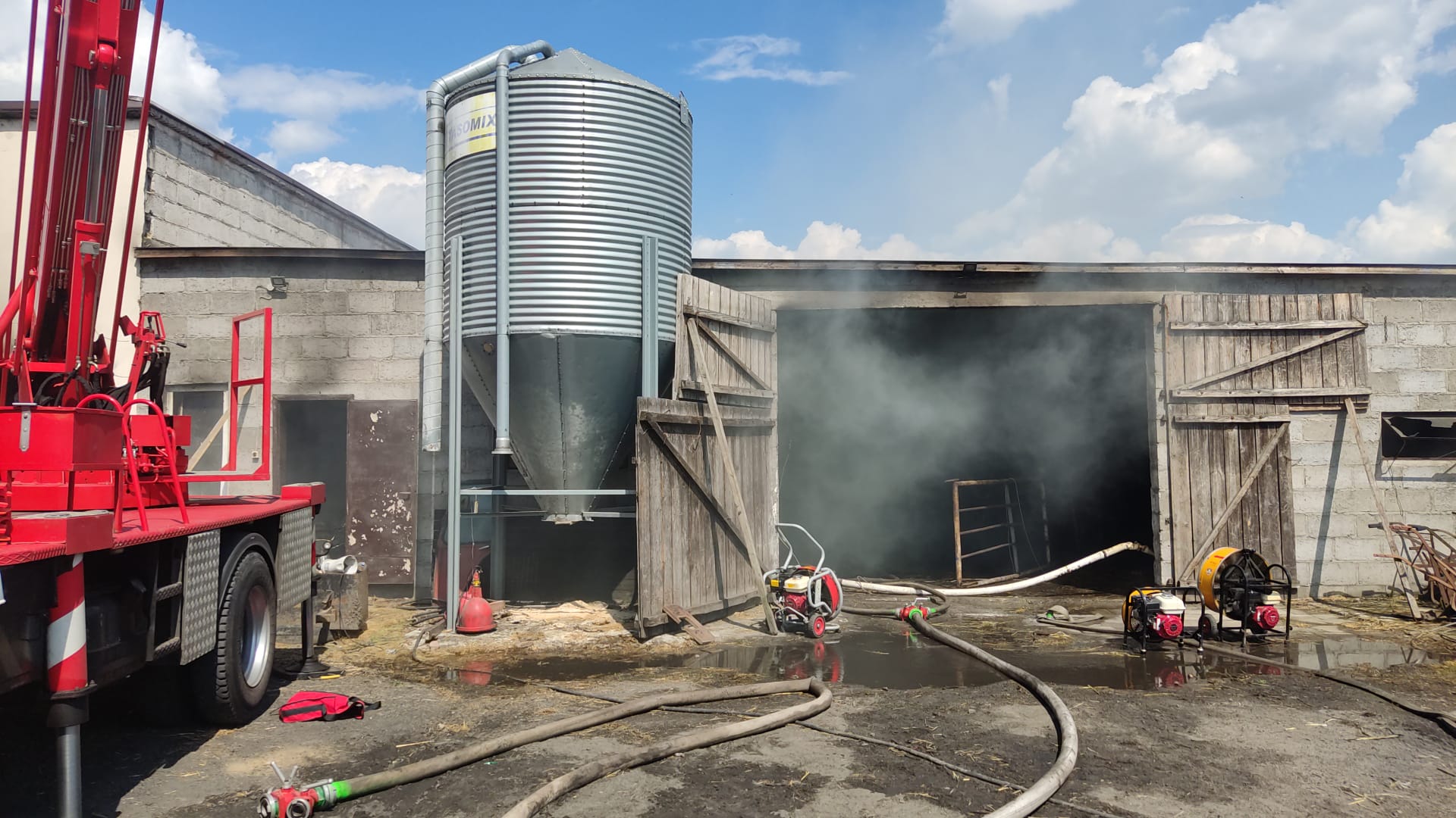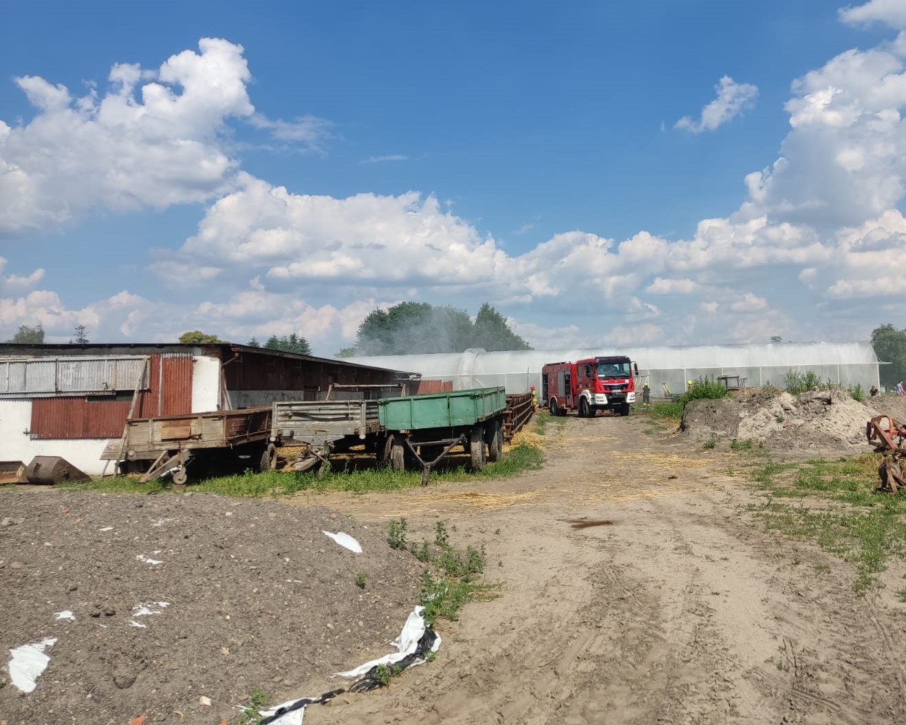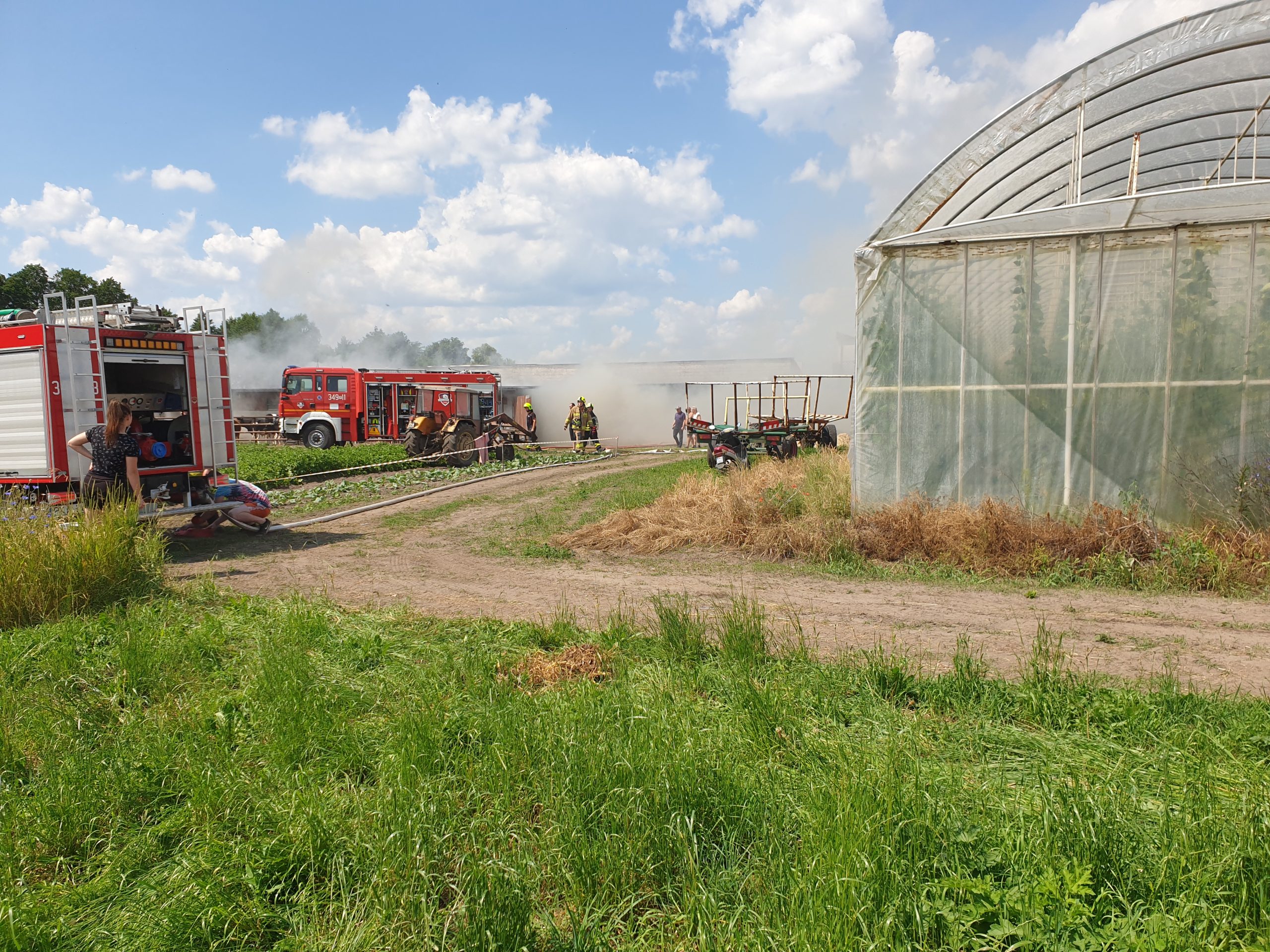 Po dojeździe na miejsce pierwszych zastępów ustalono, że na terenie gospodarstwa rolnego występuje duże zadymienie, a wewnątrz budynku gospodarczego palą się składowane baloty siana oraz sprzęt rolniczy.