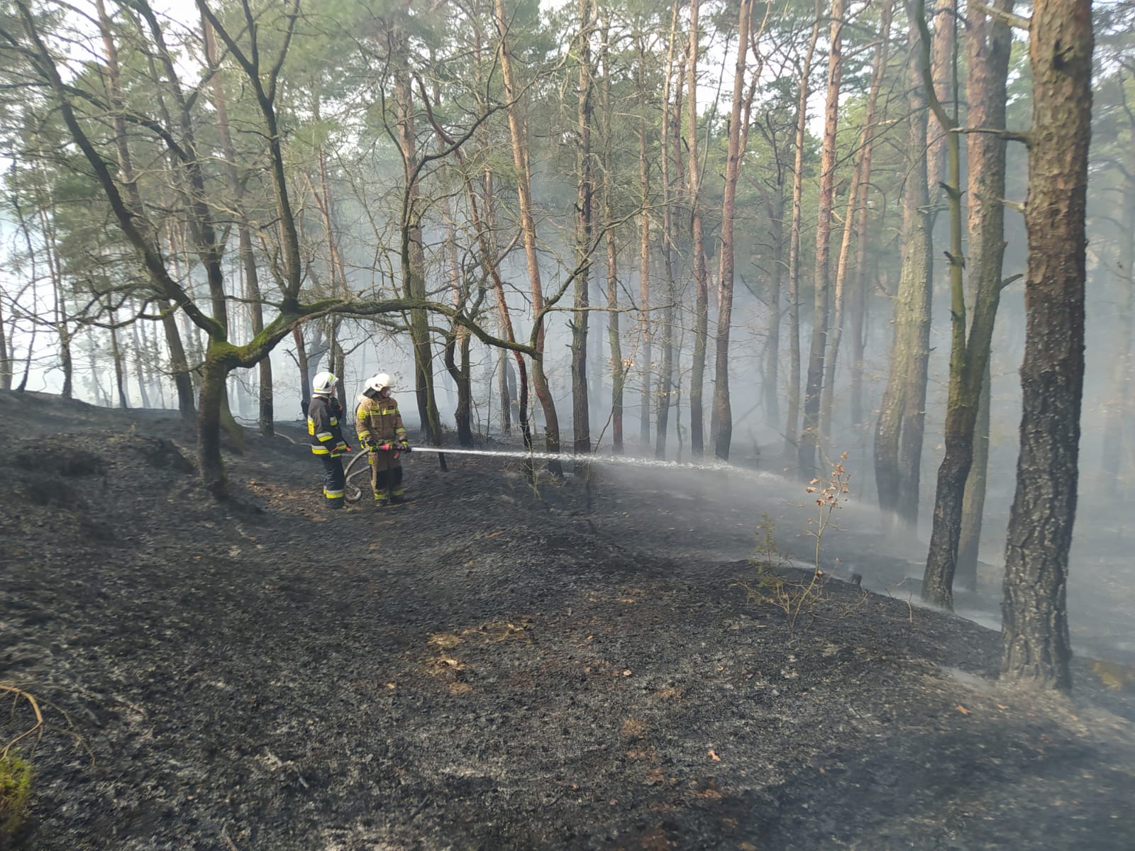 Działania gaśnicze prowadzono jednocześnie w trzech miejscach podając wodę na palące się drzewa i poszycie leśne. W trakcie tych działań utworzono bufor wodny na bazie GCBA 9/60 oraz GCBA 5/32. Woda dostarczana była poprzez dowożenie z hydrantów oraz zbudowano magistralę wodną z węży W-75 na odcinku ok. 400 metrów o wydajności 1600 l/min.