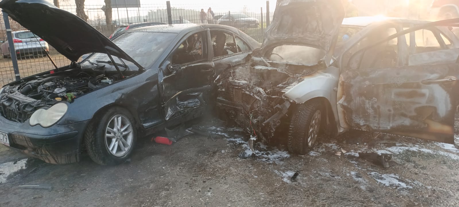 Po dojeździe na miejsce zdarzenia strażacy zastali samochód osobowy marki Hyundai, który zderzył się z pojazdem Mercedes. W wyniku zdarzenia doszło do pożaru obu pojazdów, które znajdowały się poza drogą. Kierujący i pasażerowie opuścili pojazdy przed przybyciem straży pożarnej i znajdowali się w pobliżu pod opieką świadków zdarzenia.