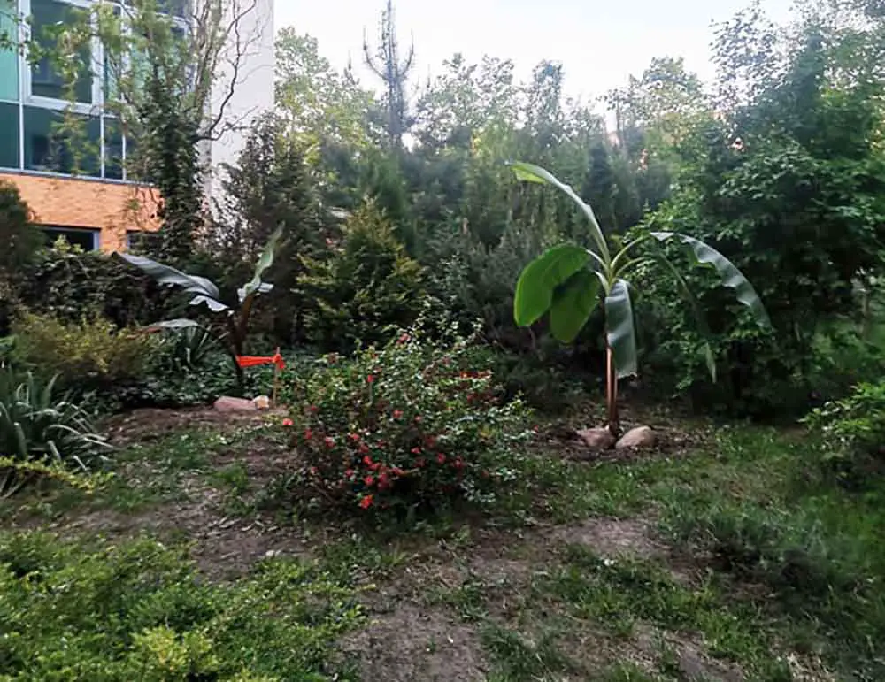 W przyszły roku od blokiem powinny zaowocować piesze ekologiczne banany.