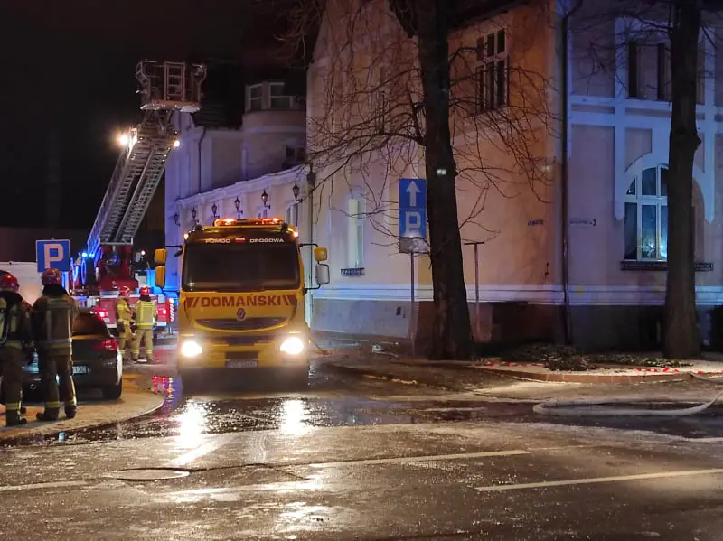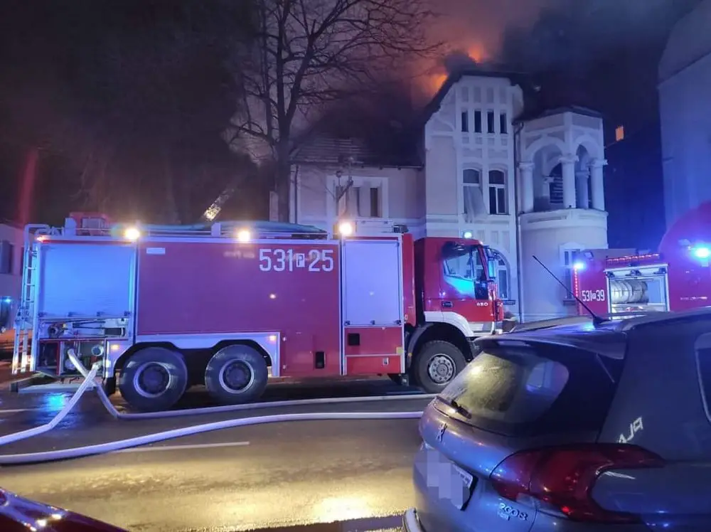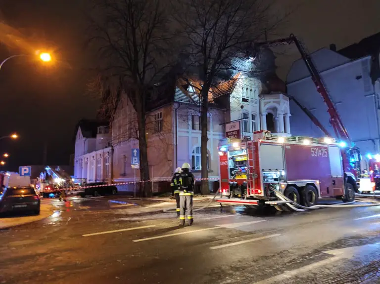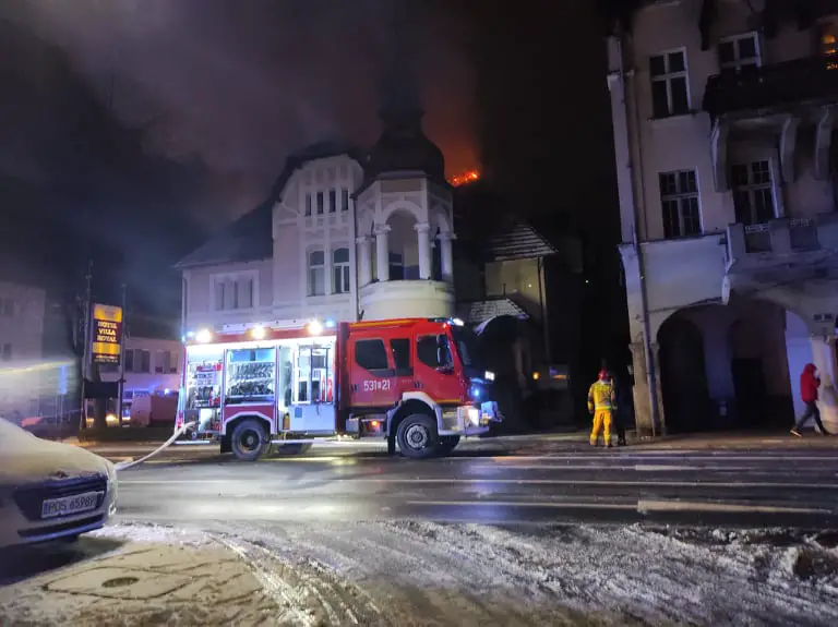 Pożar zabytkowego hotelu w Ostrowie Wielkopolskim wybuchł w piątek, 21 stycznia, około godz. 3.30 nocą. Z ogniem walczy 19 jednostek straży pożarnej zawodowej oraz OSP.