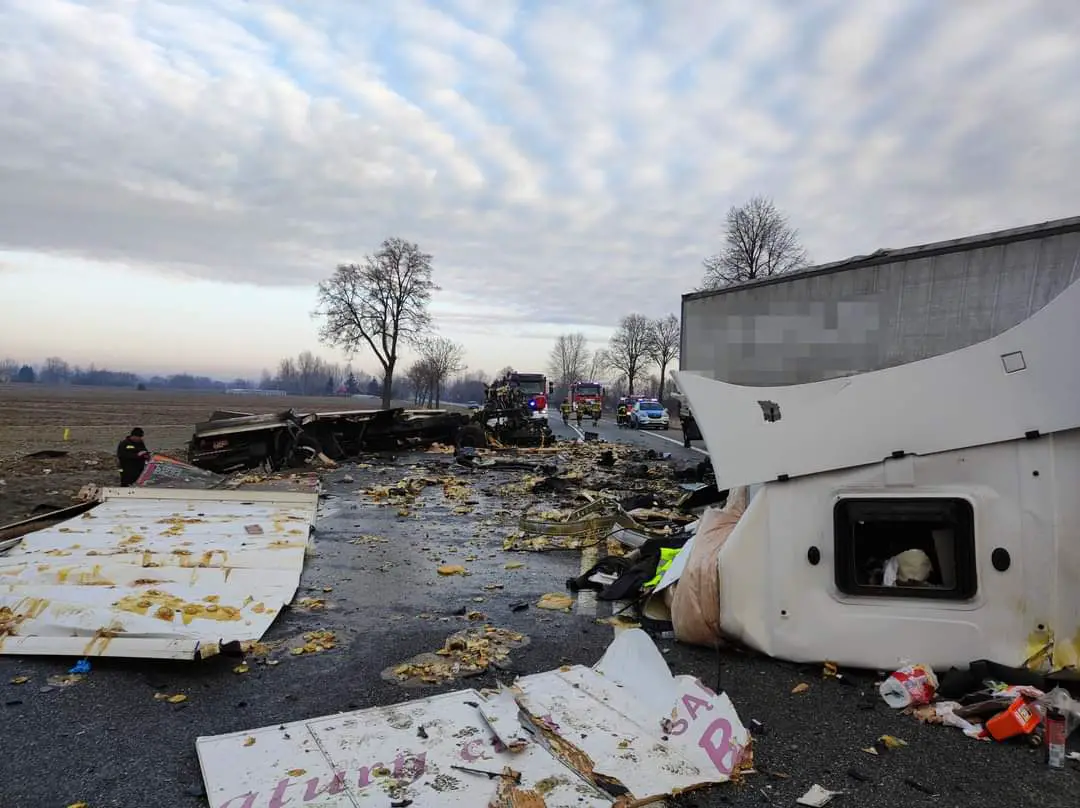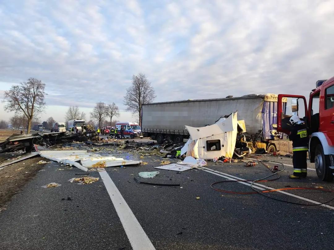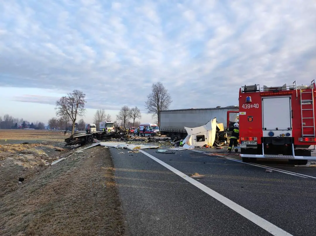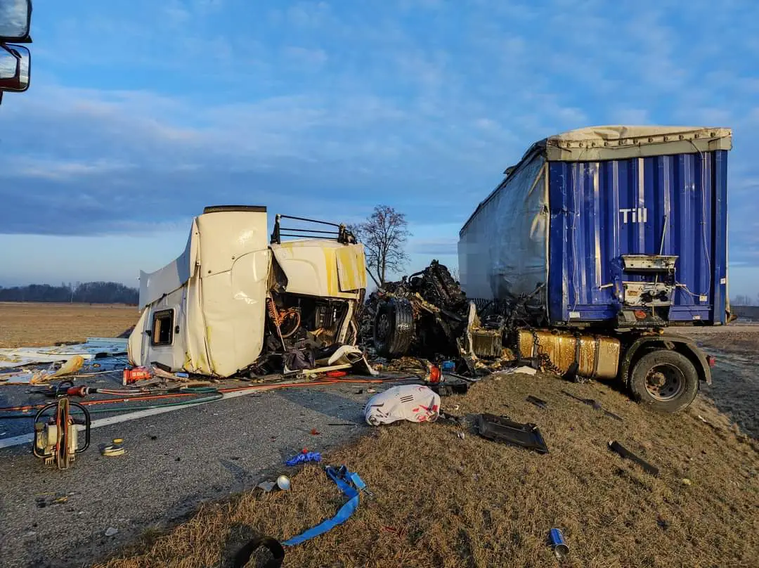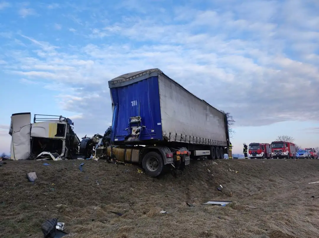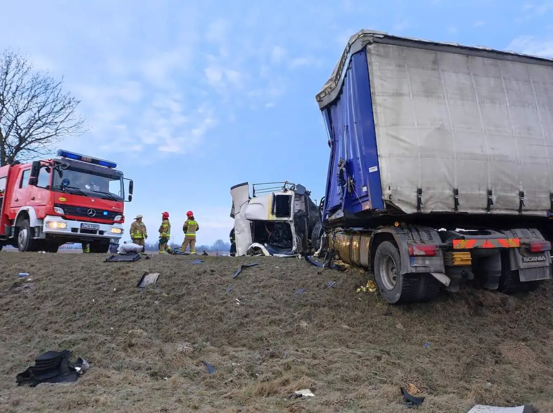 Jedna osoba zginęła na miejscu, jedna została ranna. To bilans wypadku z udziałem dwóch samochodów ciężarowych.