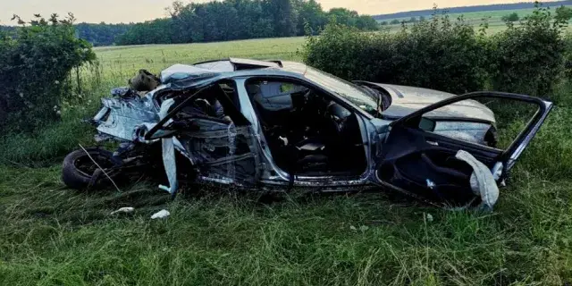 Rozpędzone bmw wypadło z drogi i z dużą siłą uderzyło w drzewo. Siła zderzenia była potężna. Samochód został dosłownie zmiażdżony.