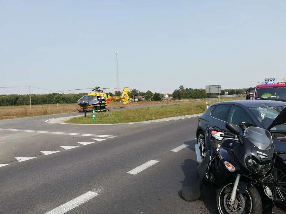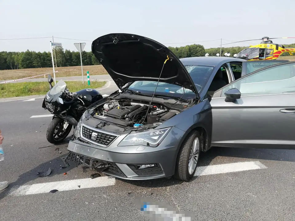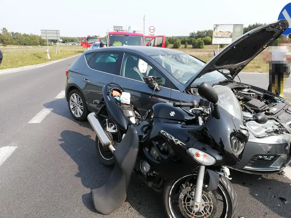 Kierujący seatem skręcając z drogi wojewódzkiej nr 196 w drogę do miejscowości zajechał drogę motocykliście na suzuki. Na miejsce zdarzenia szybko dotarły służby ratunkowe. Wylądował również śmigłowiec lotniczego pogotowia ratunkowego. Pierwsi pomocy osobie poszkodowanej udzielili strażacy z OSP Skoki. Ranny motocyklista został śmigłowcem LPR zabrany do szpitala w Poznaniu. Strażacy zabezpieczyli miejsce zdarzenia.