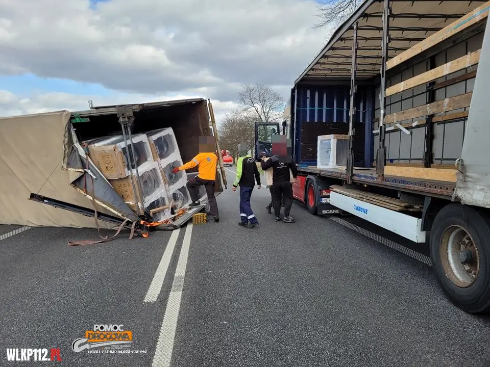 Na miejsce zdarzenia przybył zastępczy samochód ciężarowy z naczepą, do której pracownicy firmy transportowej przeładowali sprzęt AGD. W ostatniej fazie działań pomoc drogowa postawiła uszkodzony samochód ciężarowy na koła.