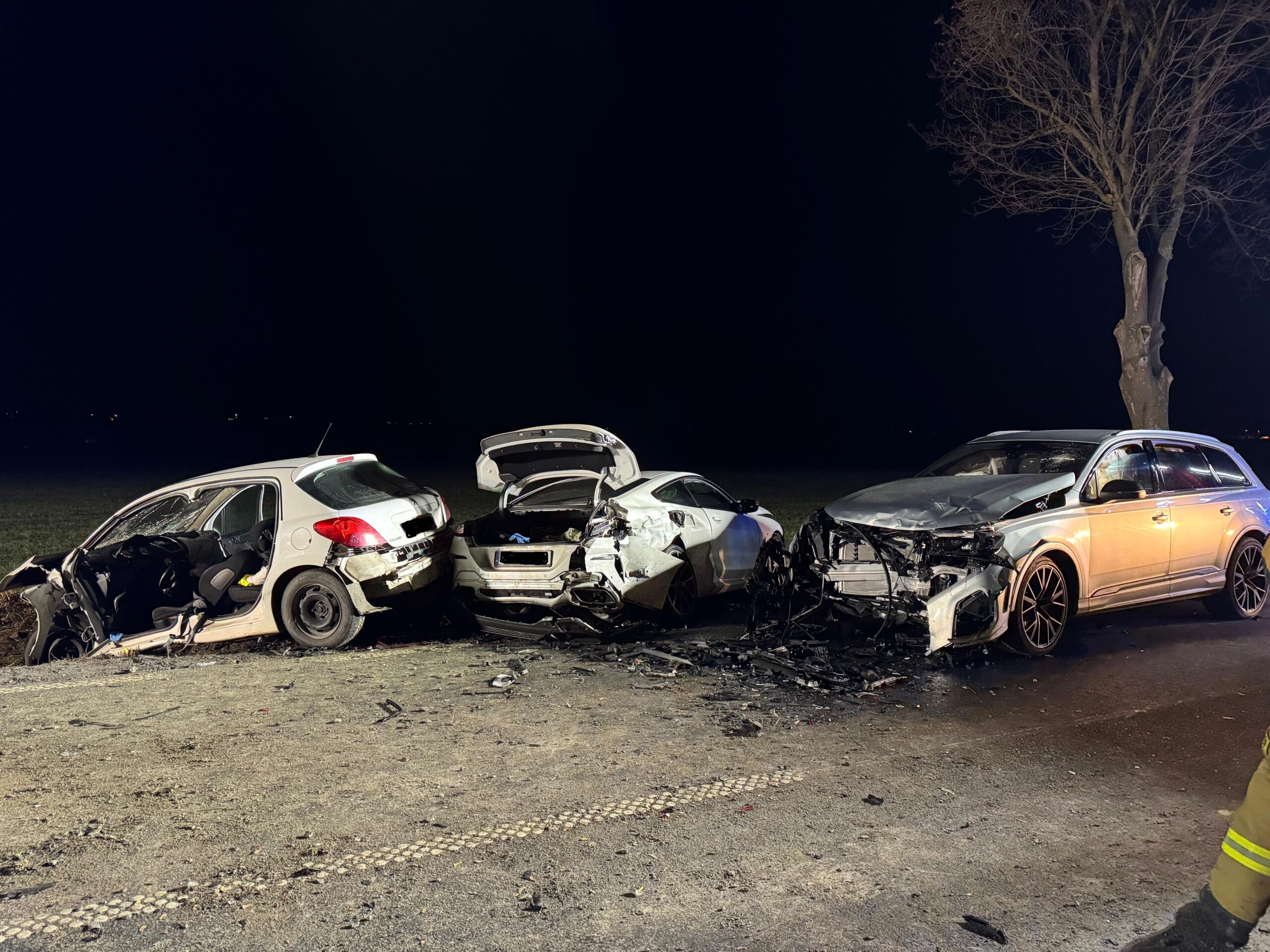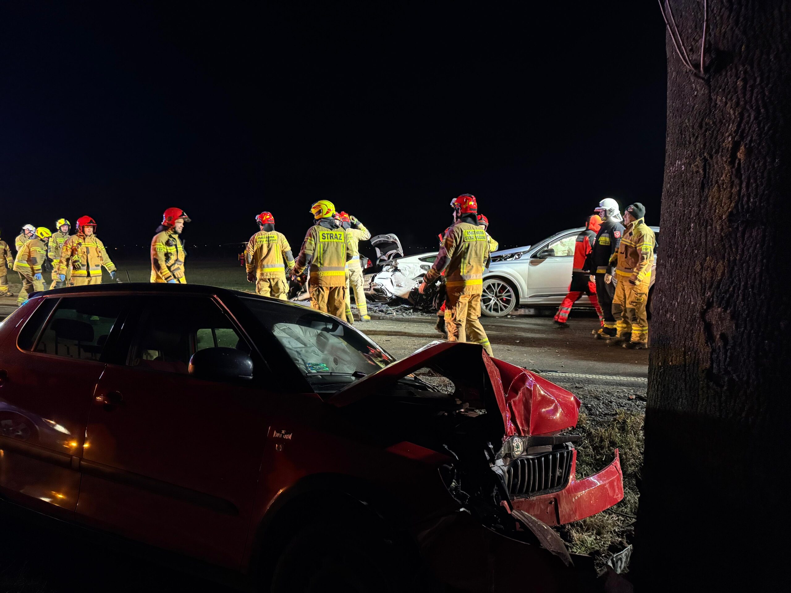 Po przybyciu zastępów straży pożarnej na miejsce zdarzenia zastano 4 samochody biorące udział w zdarzeniu znajdujące się po lewej i prawej stronie jezdni. W wyniku zdarzenia poszkodowanych zostało łącznie 5 osób, w tym jedna osoba była uwięziona w pojeździe.